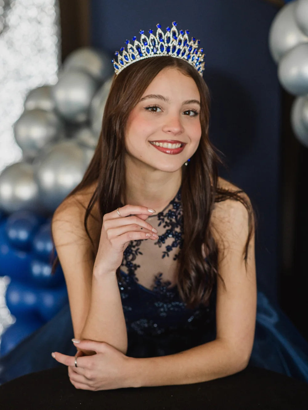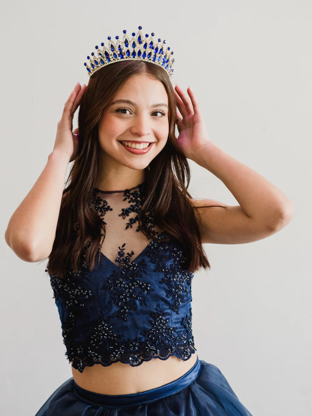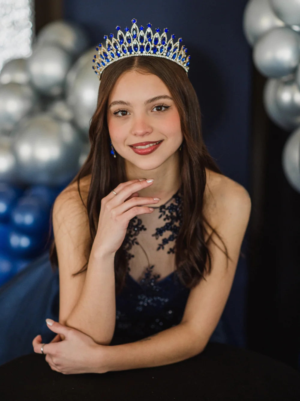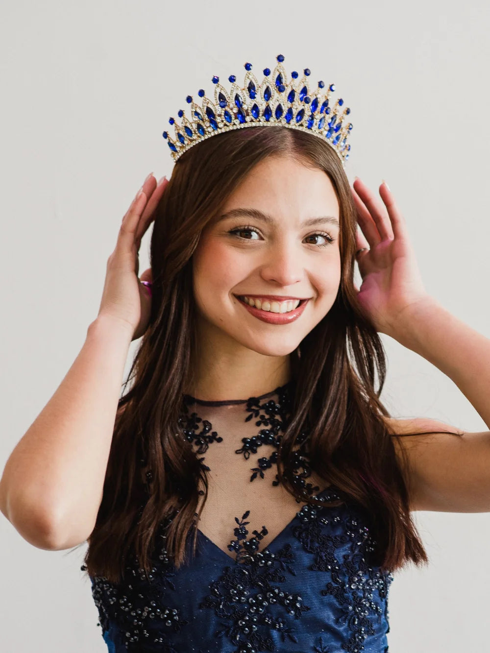 Cumbre Real – Azul es una pieza de elegancia atemporal, diseñada para coronar momentos inolvidables. Su presencia es majestuosa, pero no recargada. Brilla con luz propia y proyecta una imagen nítida de realeza, sofisticación y perfección. Este accesorio está pensado para mujeres que desean destacarse con un estilo moderno y poderoso, sin exageraciones.