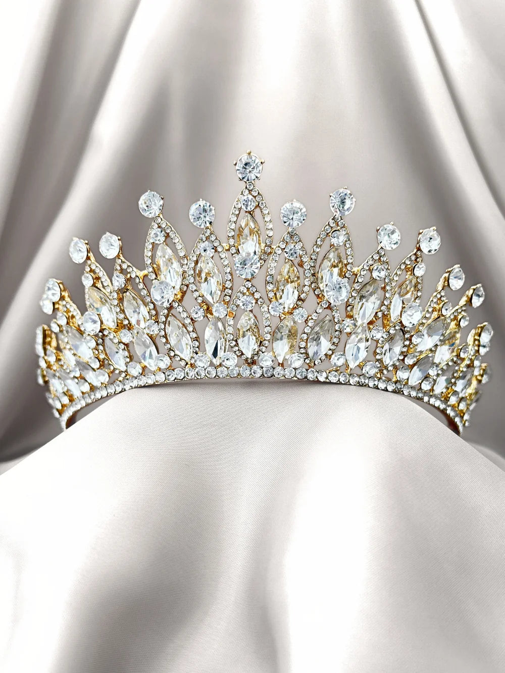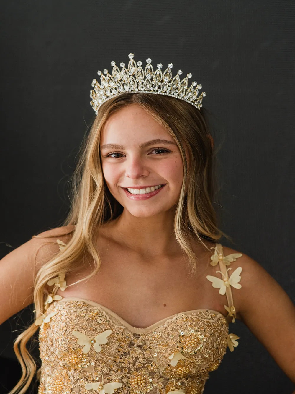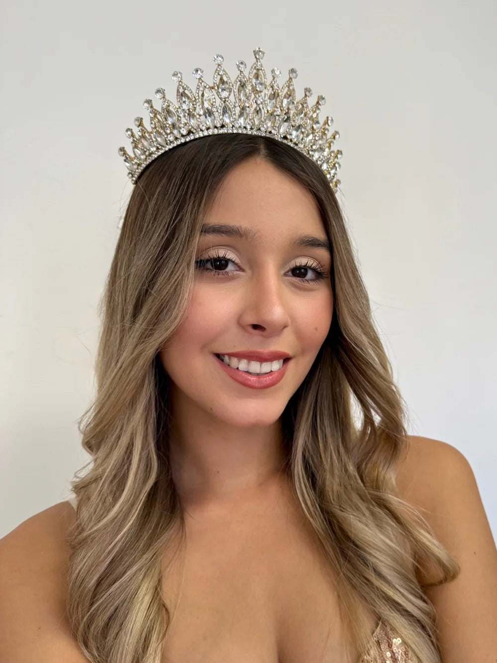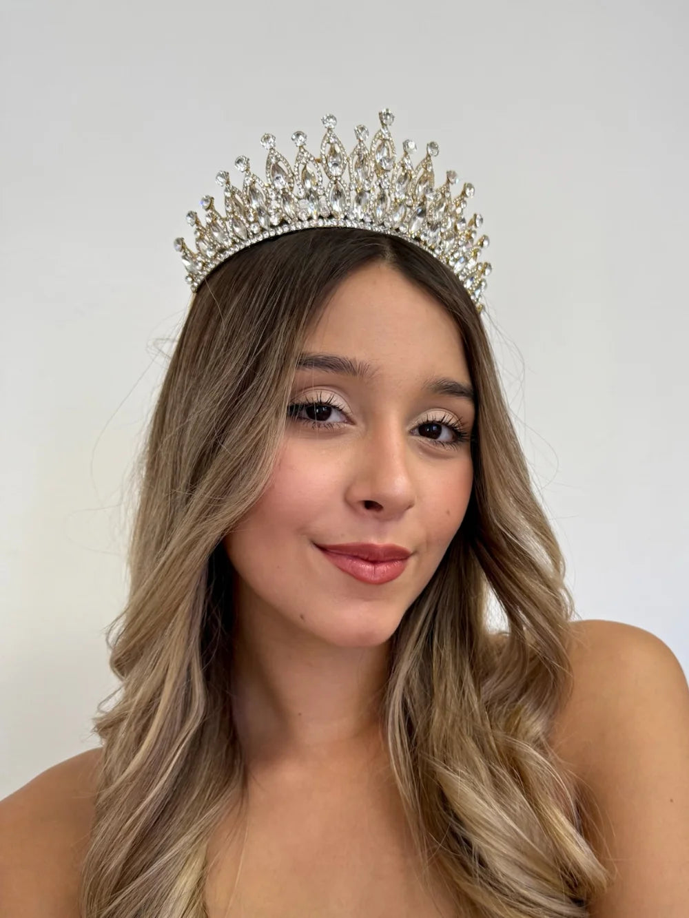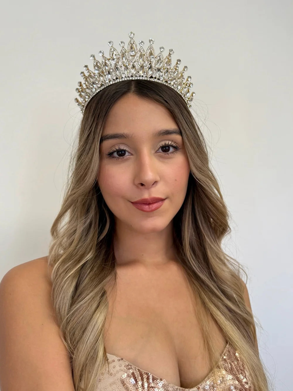 Corona Cumbre Real – Champagne es una tiara que refleja la elegancia en su forma más sublime. Con una estructura que combina la majestuosidad de los diseños imperiales con la calidez de los tonos dorados, esta pieza fue pensada para quienes desean destacar con una estética lujosa, femenina y llena de luz. Ideal para quinceañeras que sueñan con una entrada inolvidable, esta joya se convierte en el centro visual de cualquier estilismo.