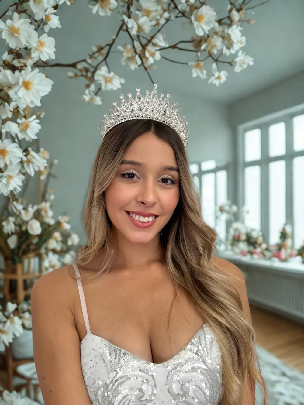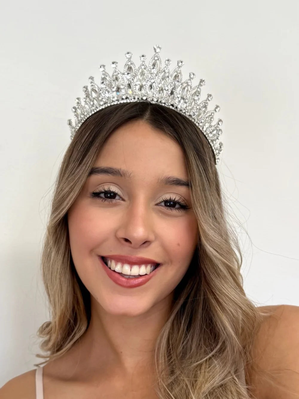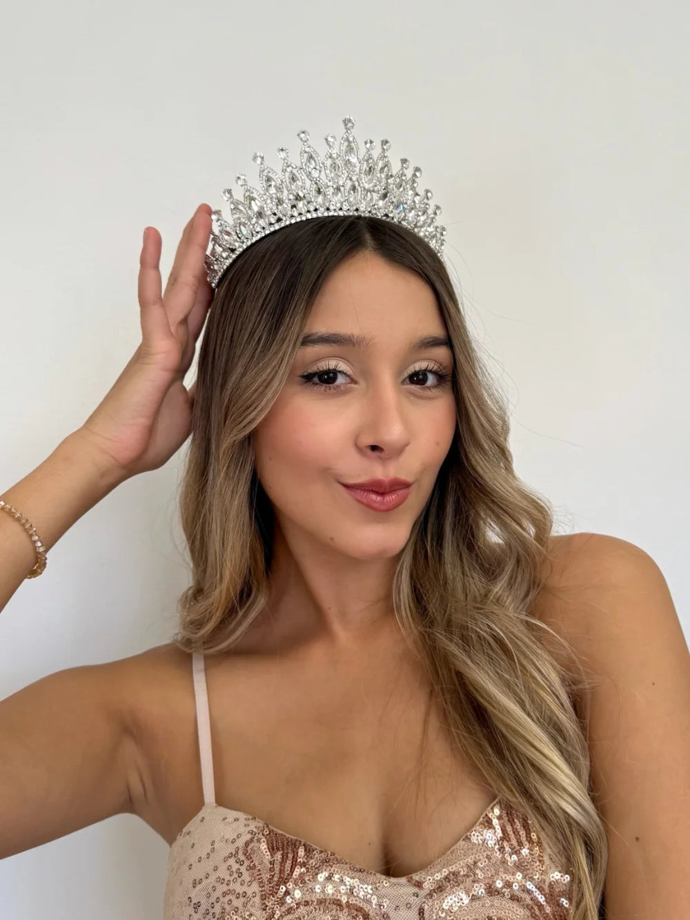 Cumbre Real – Cristal es una pieza de elegancia atemporal, diseñada para coronar momentos inolvidables. Su presencia es majestuosa, pero no recargada. Brilla con luz propia y proyecta una imagen nítida de realeza, sofisticación y perfección. Este accesorio está pensado para mujeres que desean destacarse con un estilo clásico y poderoso, sin exageraciones.