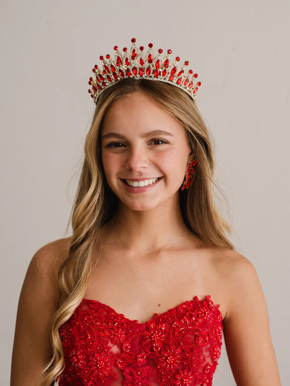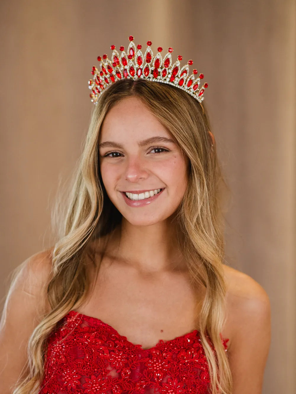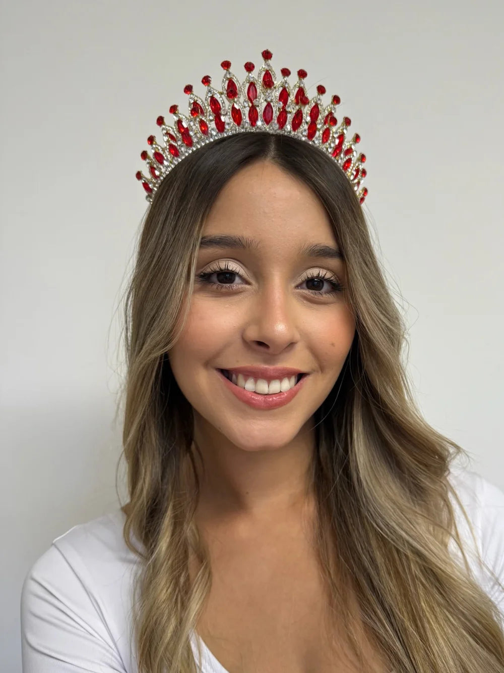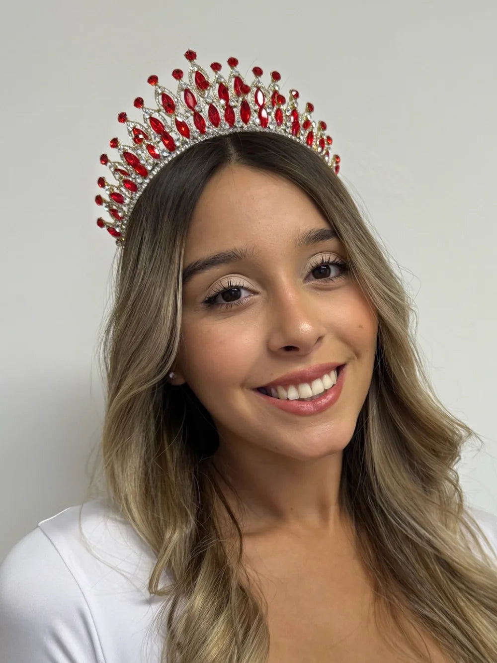 La Cumbre Real – Rubí es una tiara de alto impacto visual, diseñada para aquellas mujeres que no temen brillar con intensidad. Su diseño envolvente y audaz combina la fuerza del rojo rubí con el esplendor del dorado, logrando una pieza que grita realeza desde todos los ángulos.