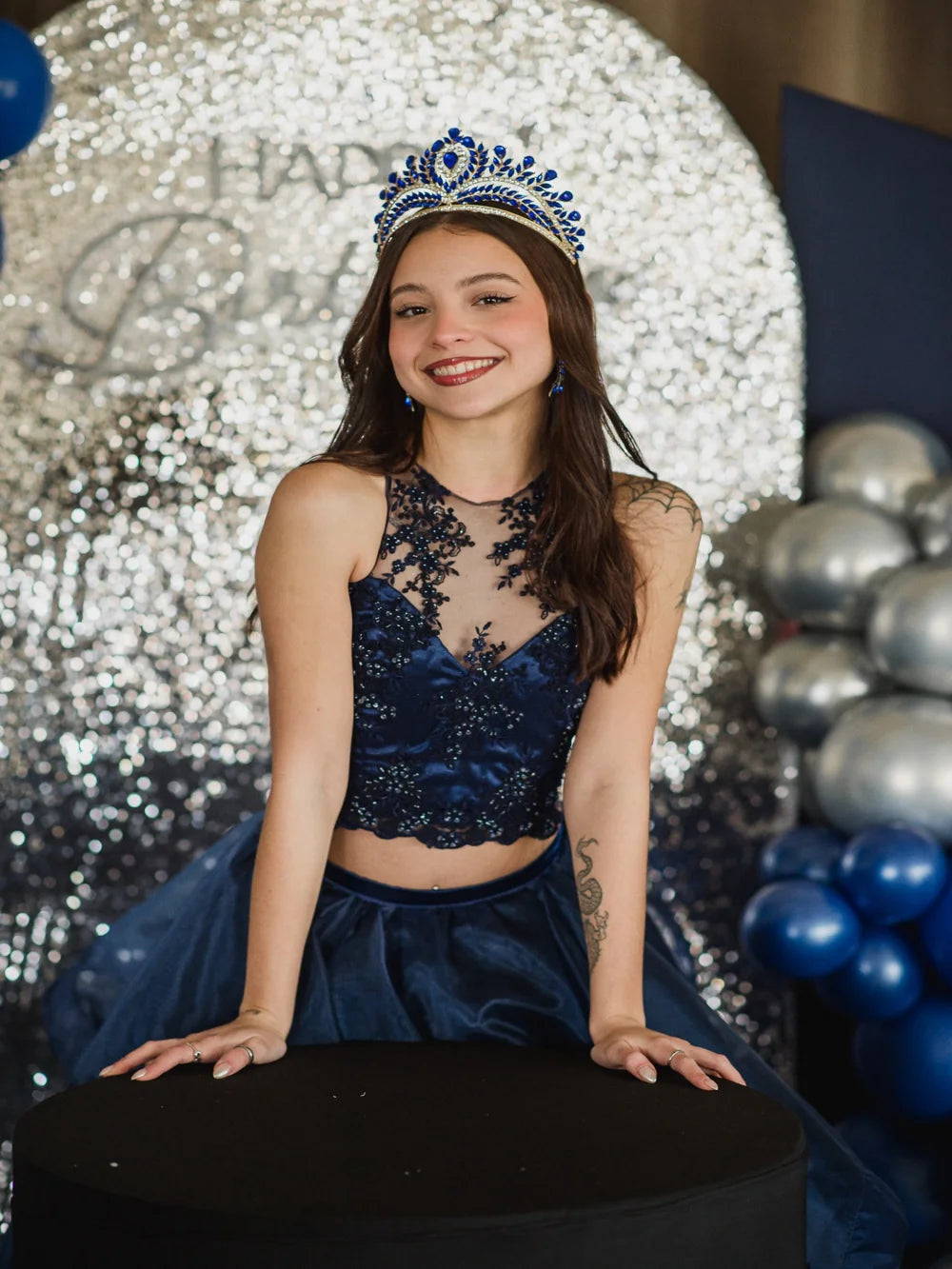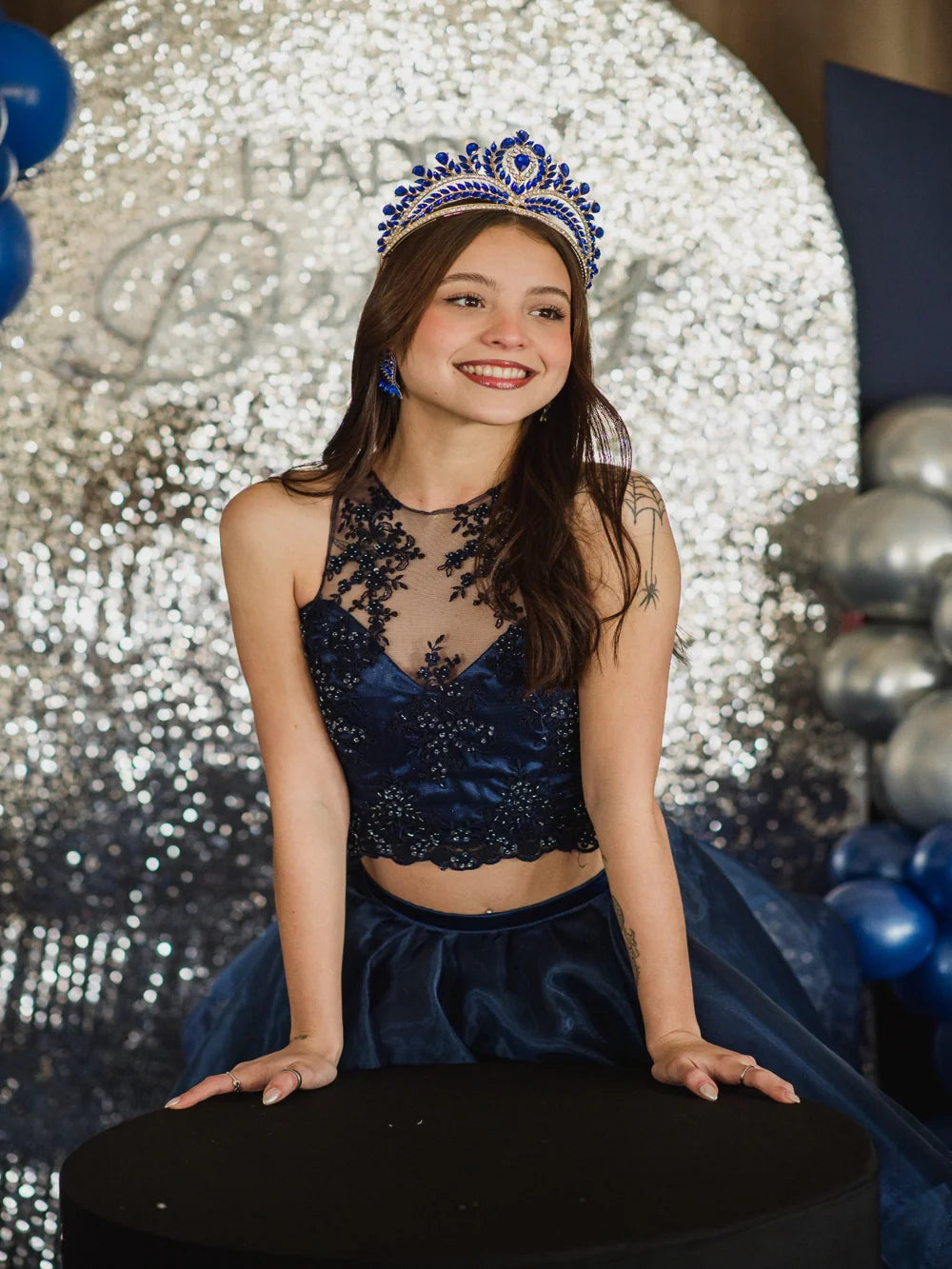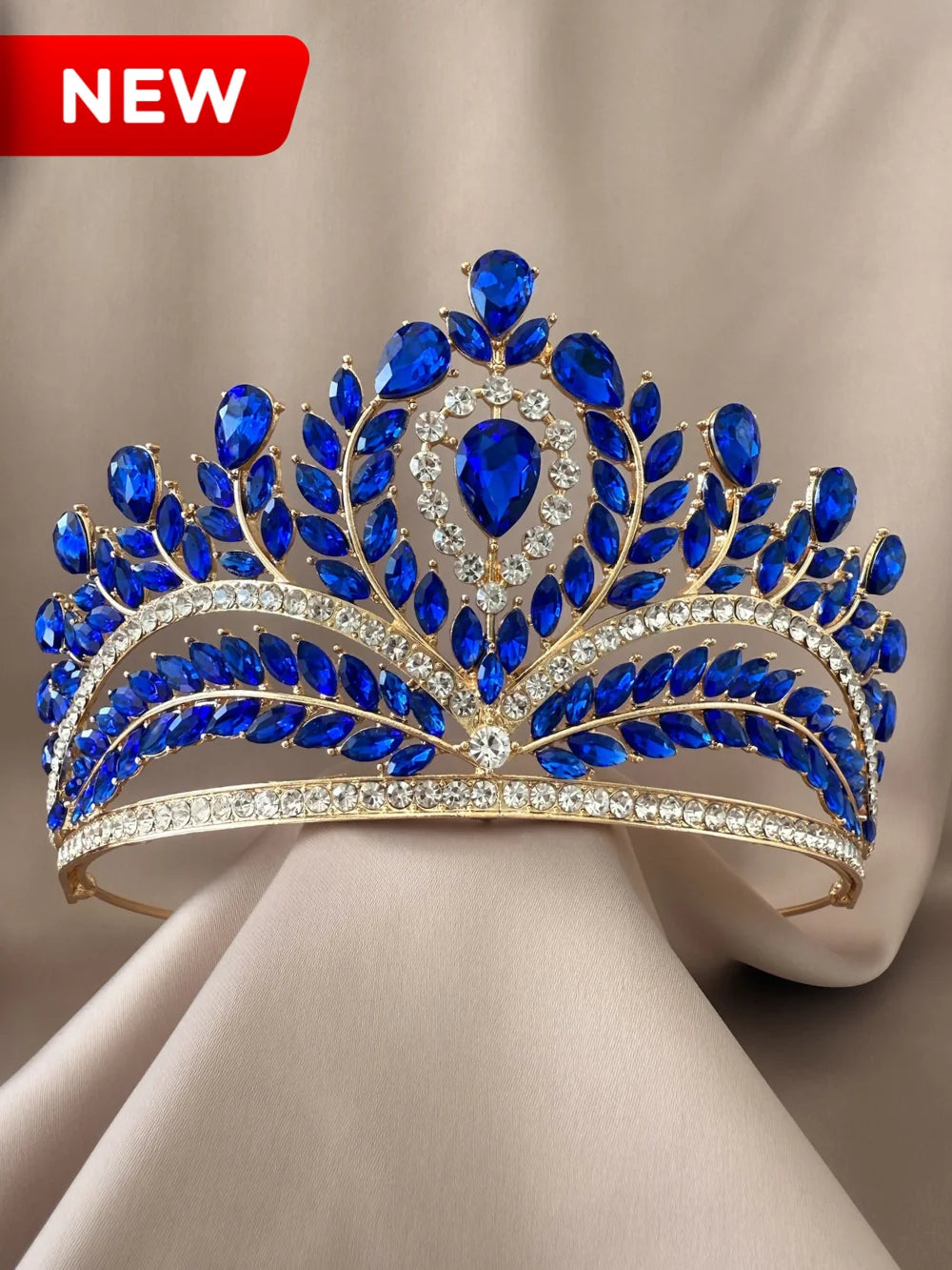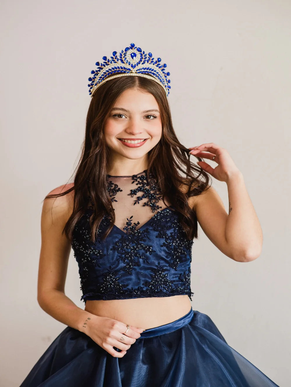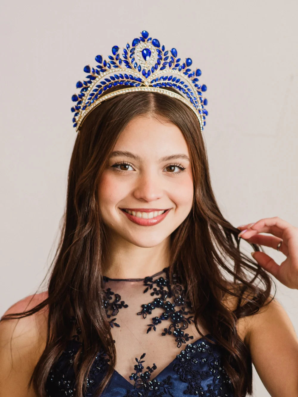 La Corona Elipse de Cristal Azul impacta con un tono profundo y majestuoso, símbolo de realeza y poder. Sus gemas en azul intenso resaltan en cualquier peinado, logrando un efecto imponente y sofisticado. Perfecta para quinceañeras que desean destacar con un accesorio diferente y lleno de personalidad.