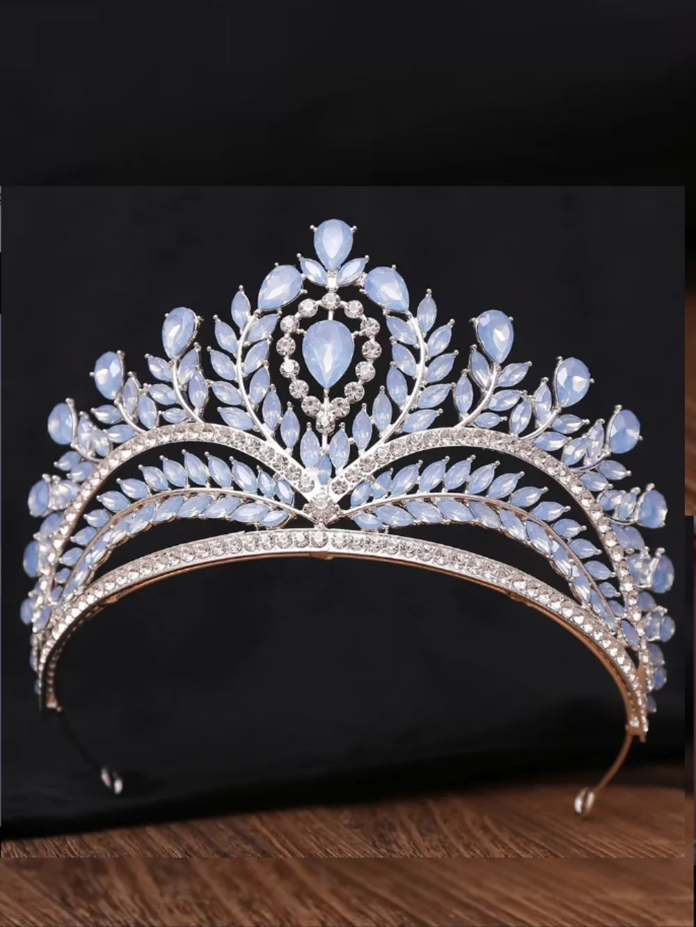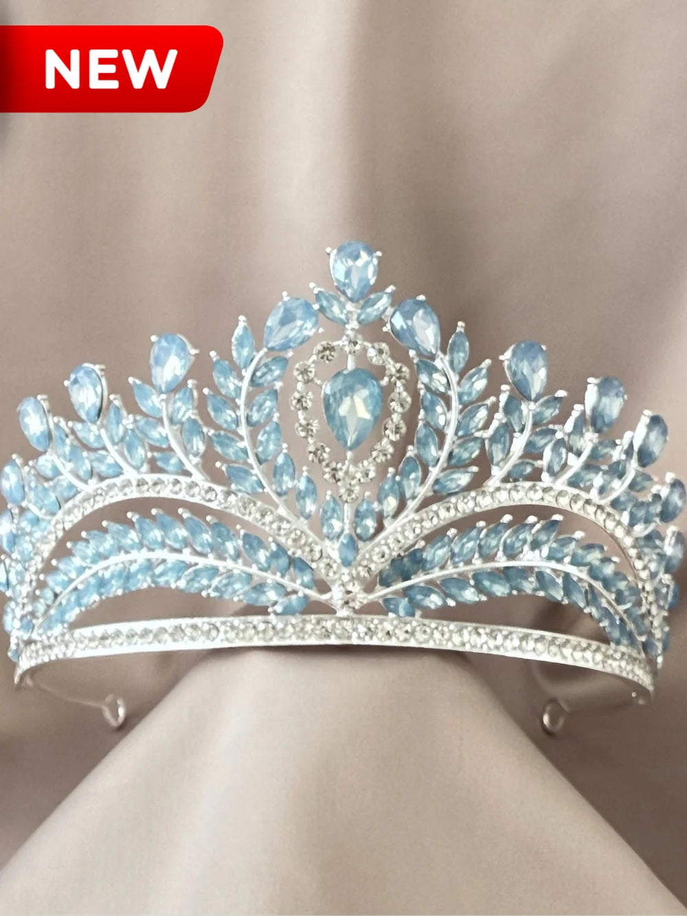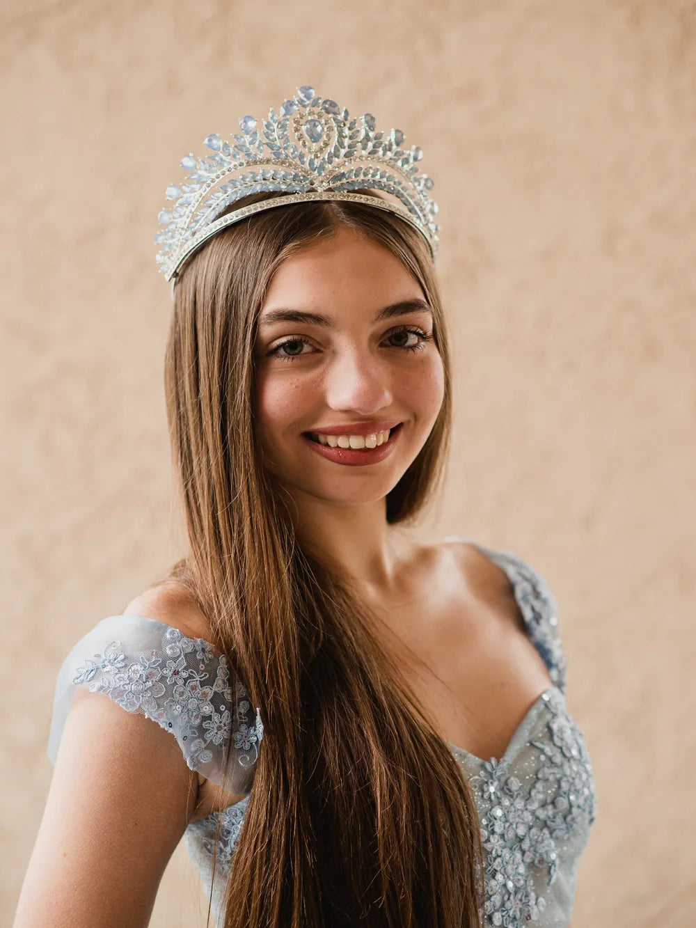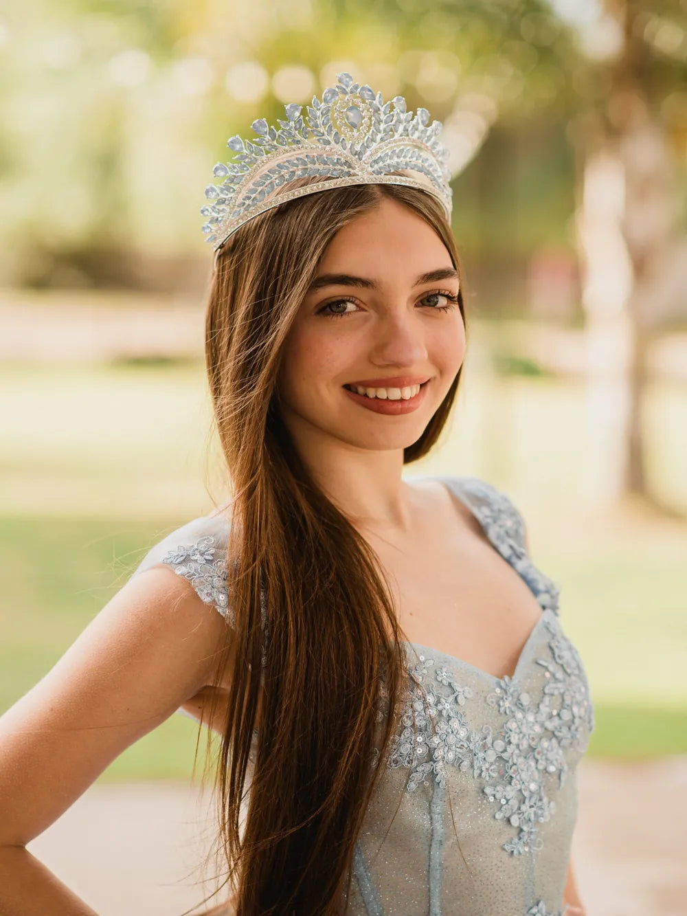 La Corona Elipse de Cristal Celeste deslumbra con un tono suave y elegante que transmite frescura y romanticismo. Sus gemas en color celeste, montadas sobre una base plateada de alta calidad, reflejan un brillo sutil que ilumina el rostro en cada fotografía. Ideal para quinceañeras que buscan un detalle original y delicado que desean una pieza distinta, con un aire etéreo y sofisticado.
