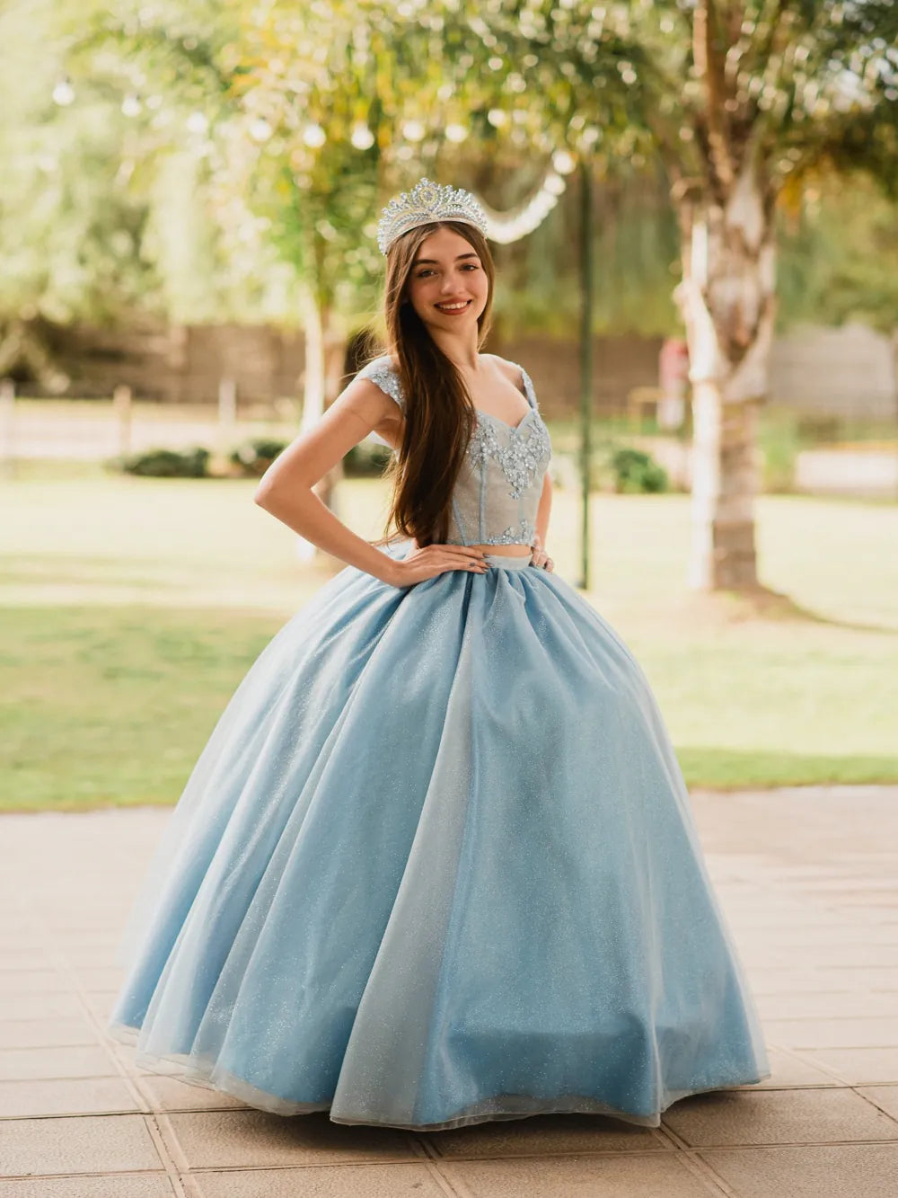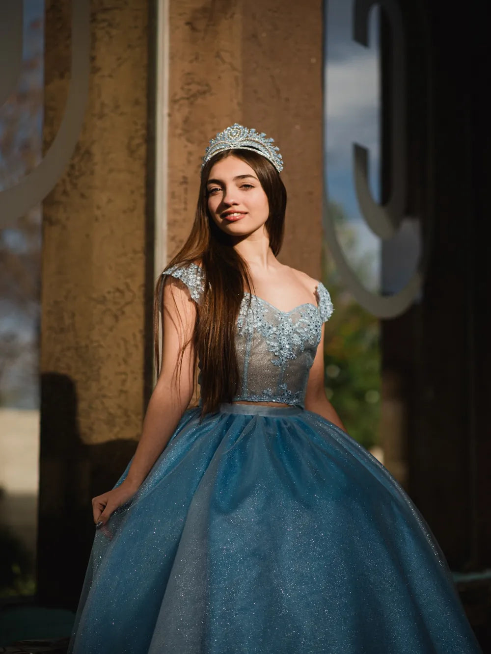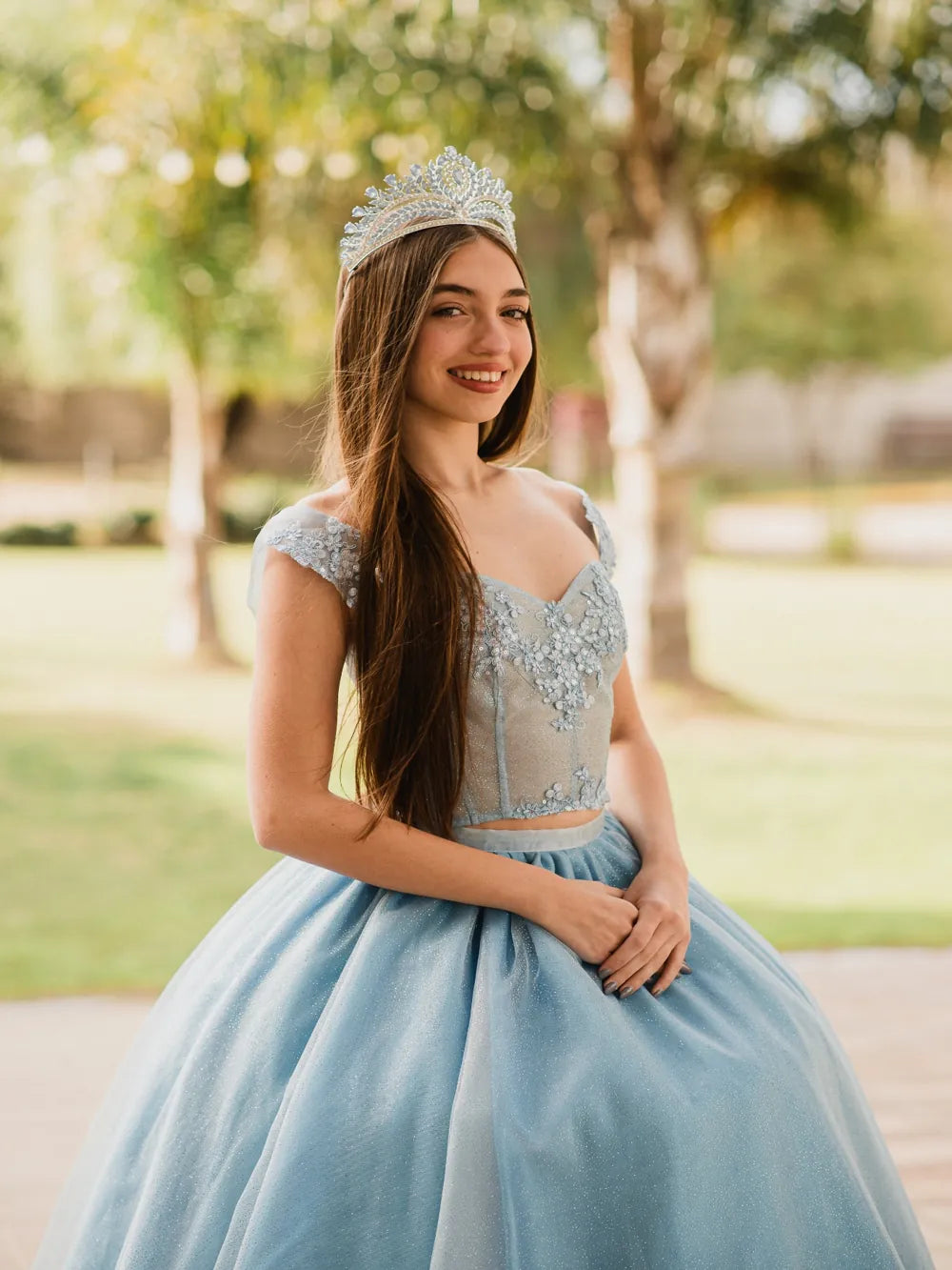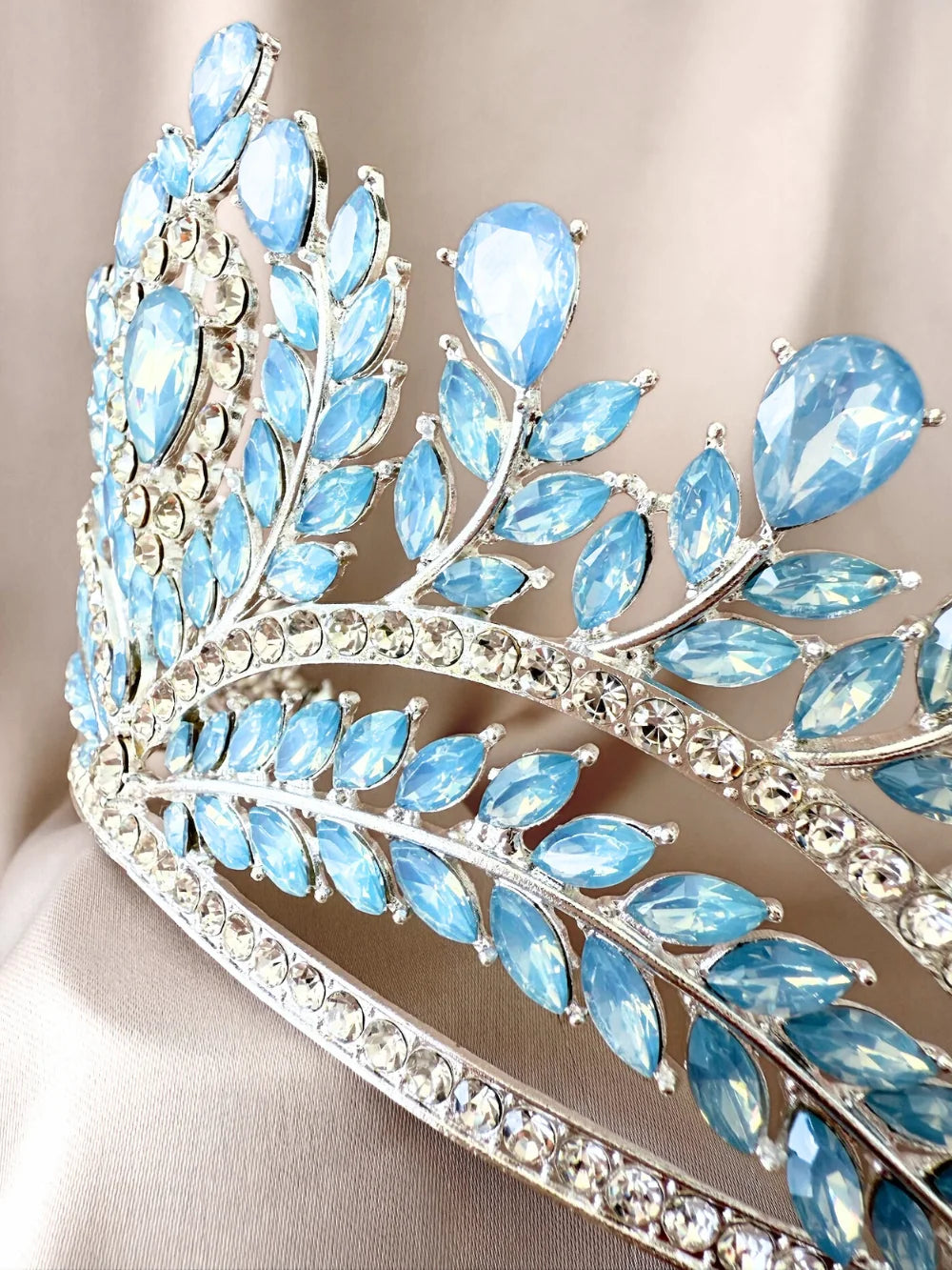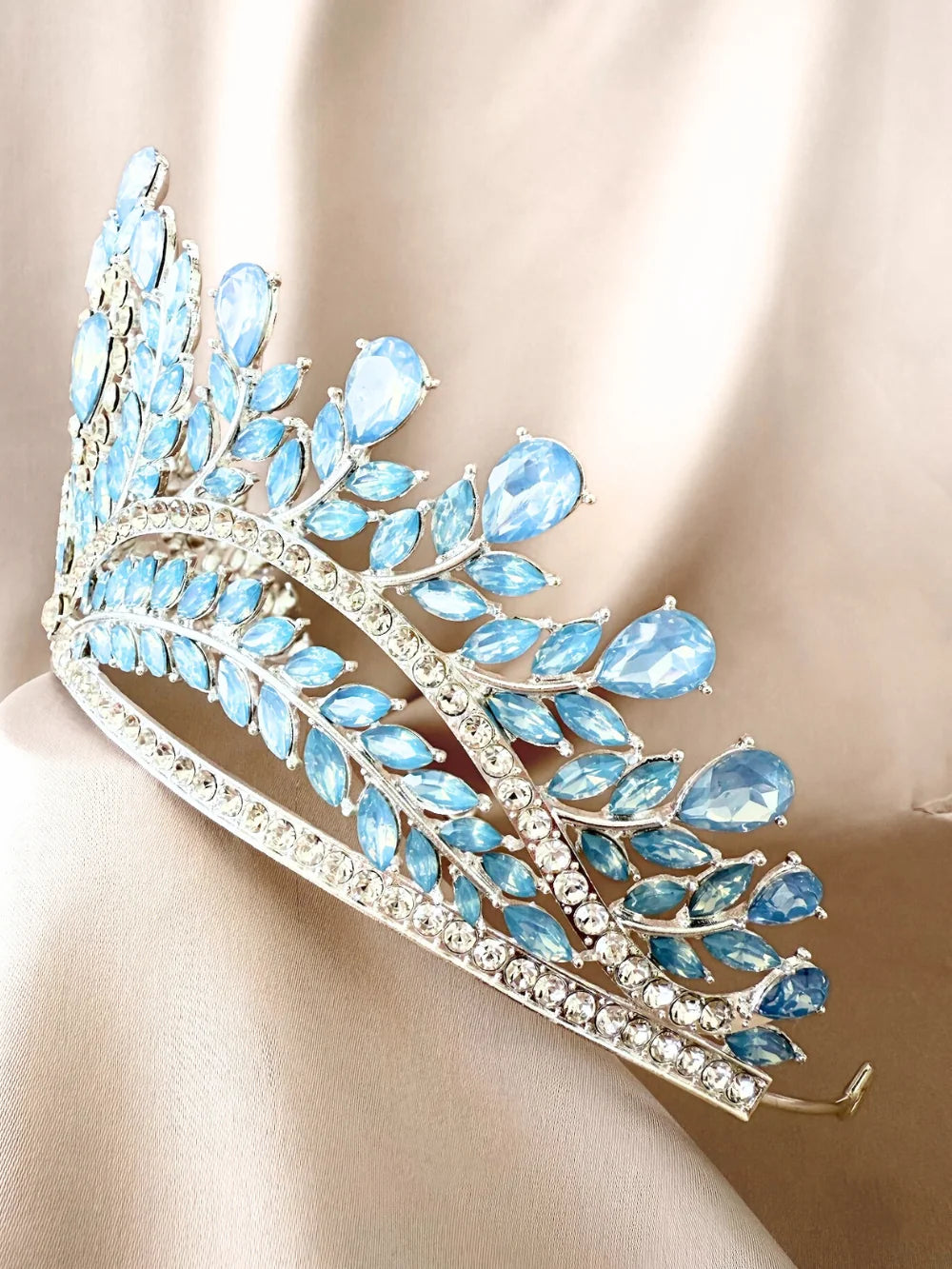 La Corona Elipse de Cristal Celeste deslumbra con un tono suave y elegante que transmite frescura y romanticismo. Sus gemas en color celeste, montadas sobre una base plateada de alta calidad, reflejan un brillo sutil que ilumina el rostro en cada fotografía. Ideal para quinceañeras que buscan un detalle original y delicado que desean una pieza distinta, con un aire etéreo y sofisticado.