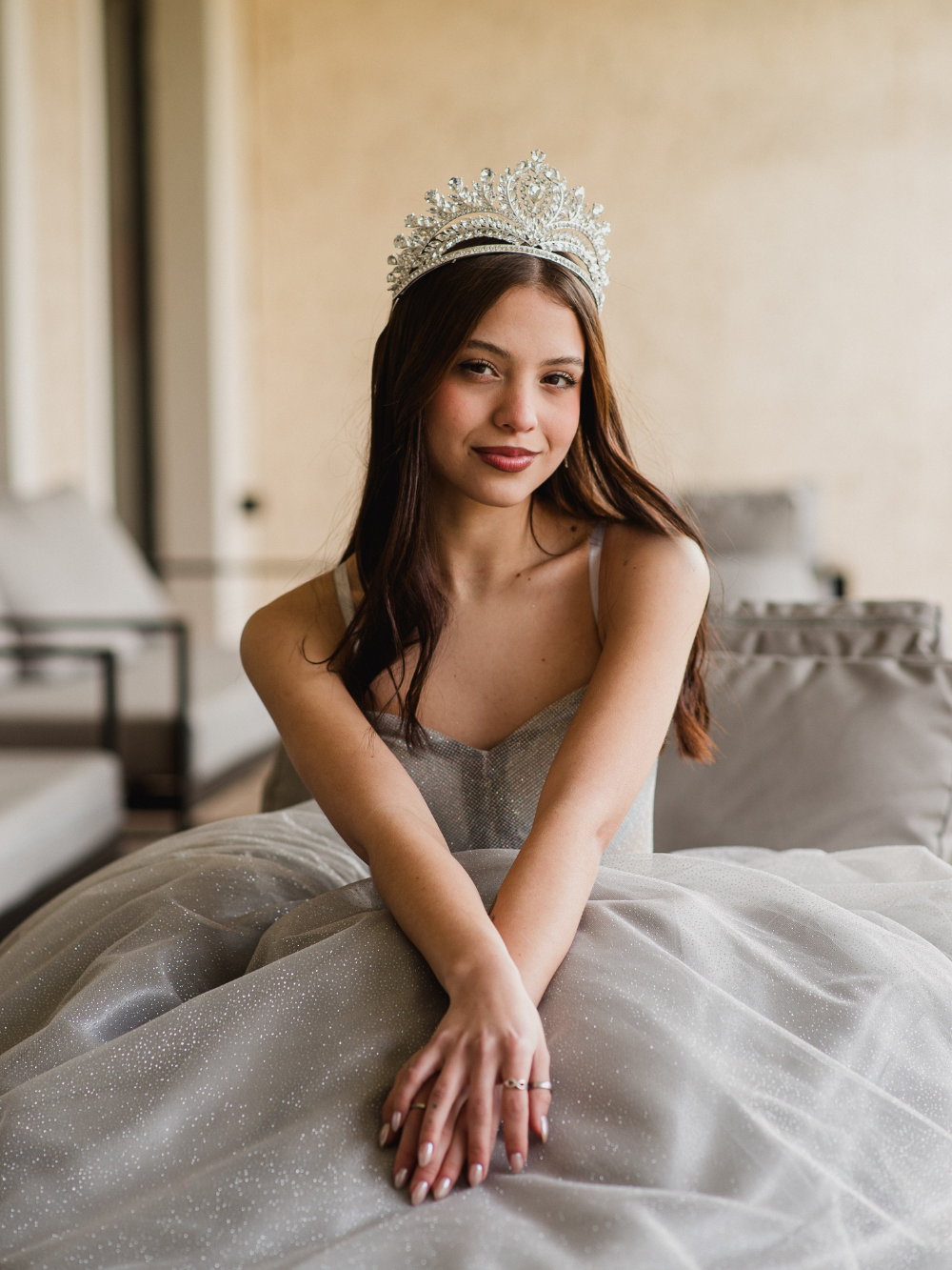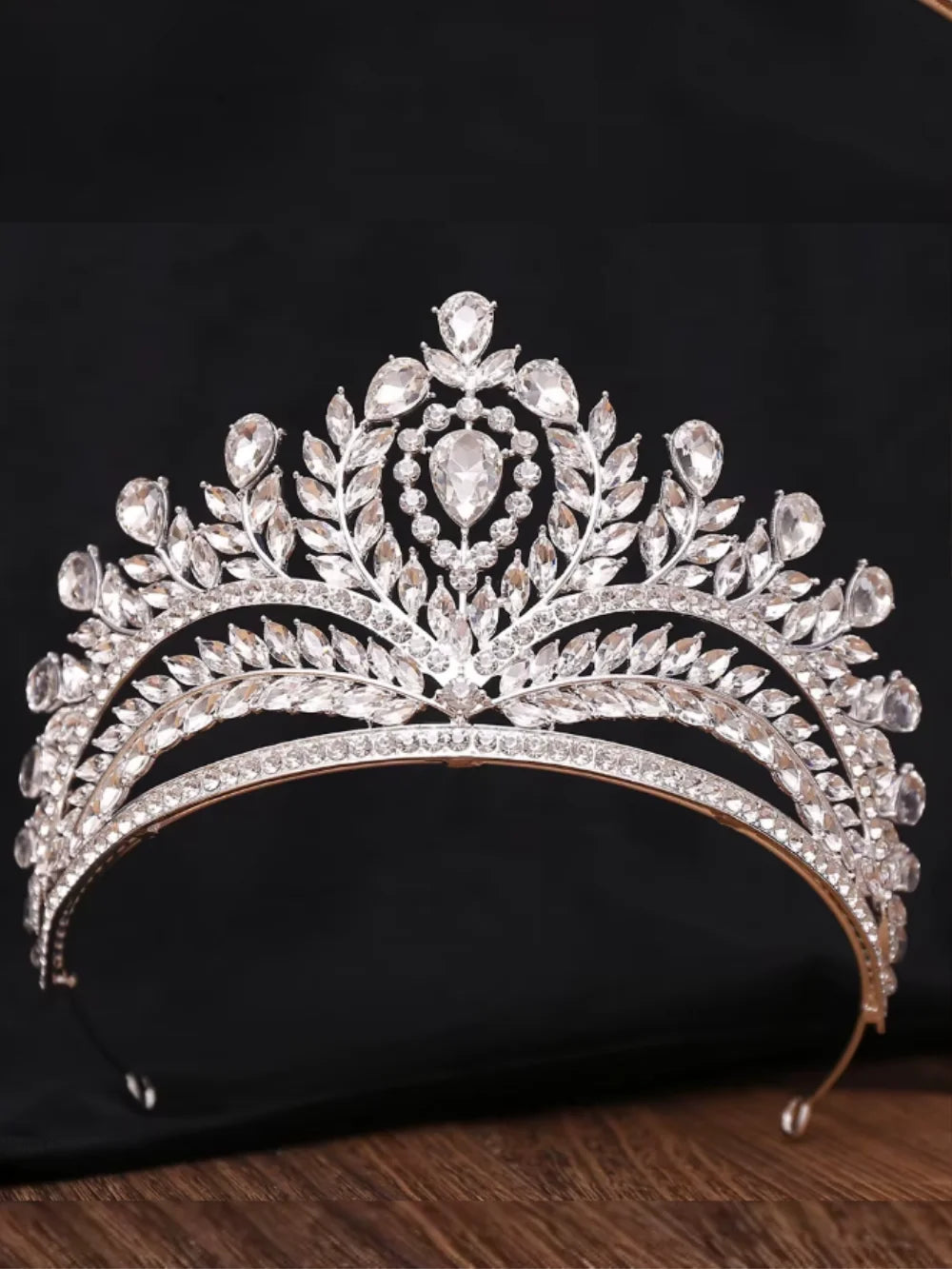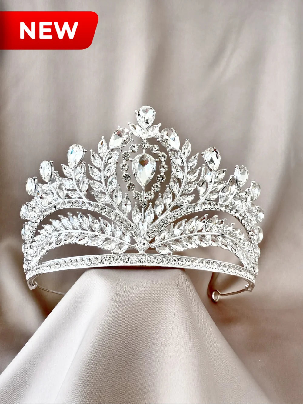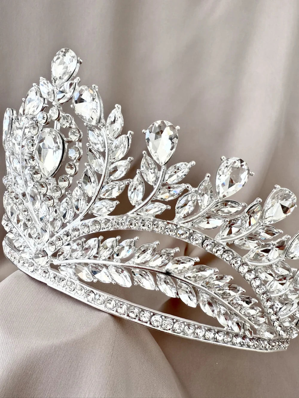 La Corona Elipse de Cristal Blanca es la elección perfecta para quienes sueñan con un look clásico y radiante. Su diseño imponente combina gemas transparentes en forma de lágrima con delicadas hojas brillantes, evocando pureza y elegancia atemporal. Una pieza versátil que realza tanto a novias en su gran día como a quinceañeras que buscan un brillo imponente y distinguido.