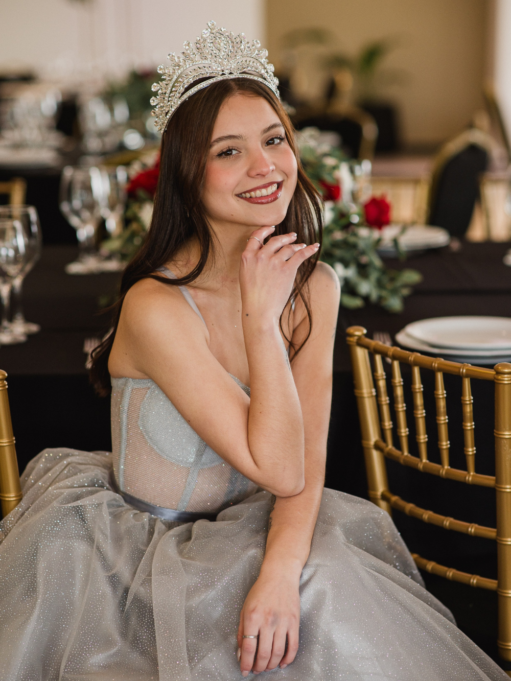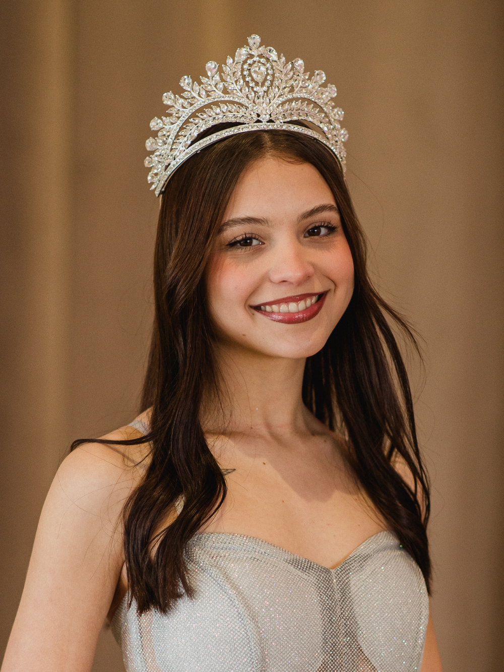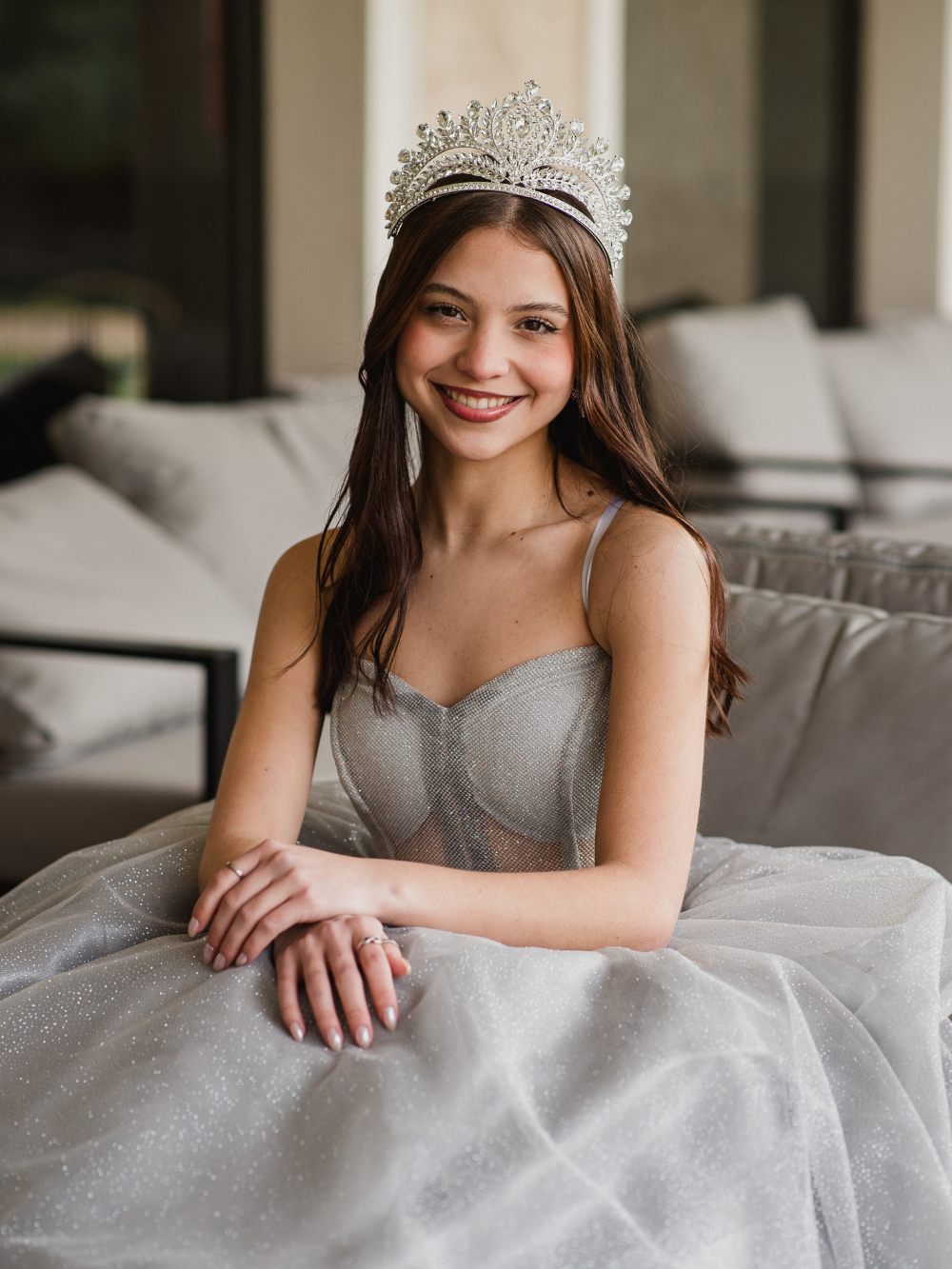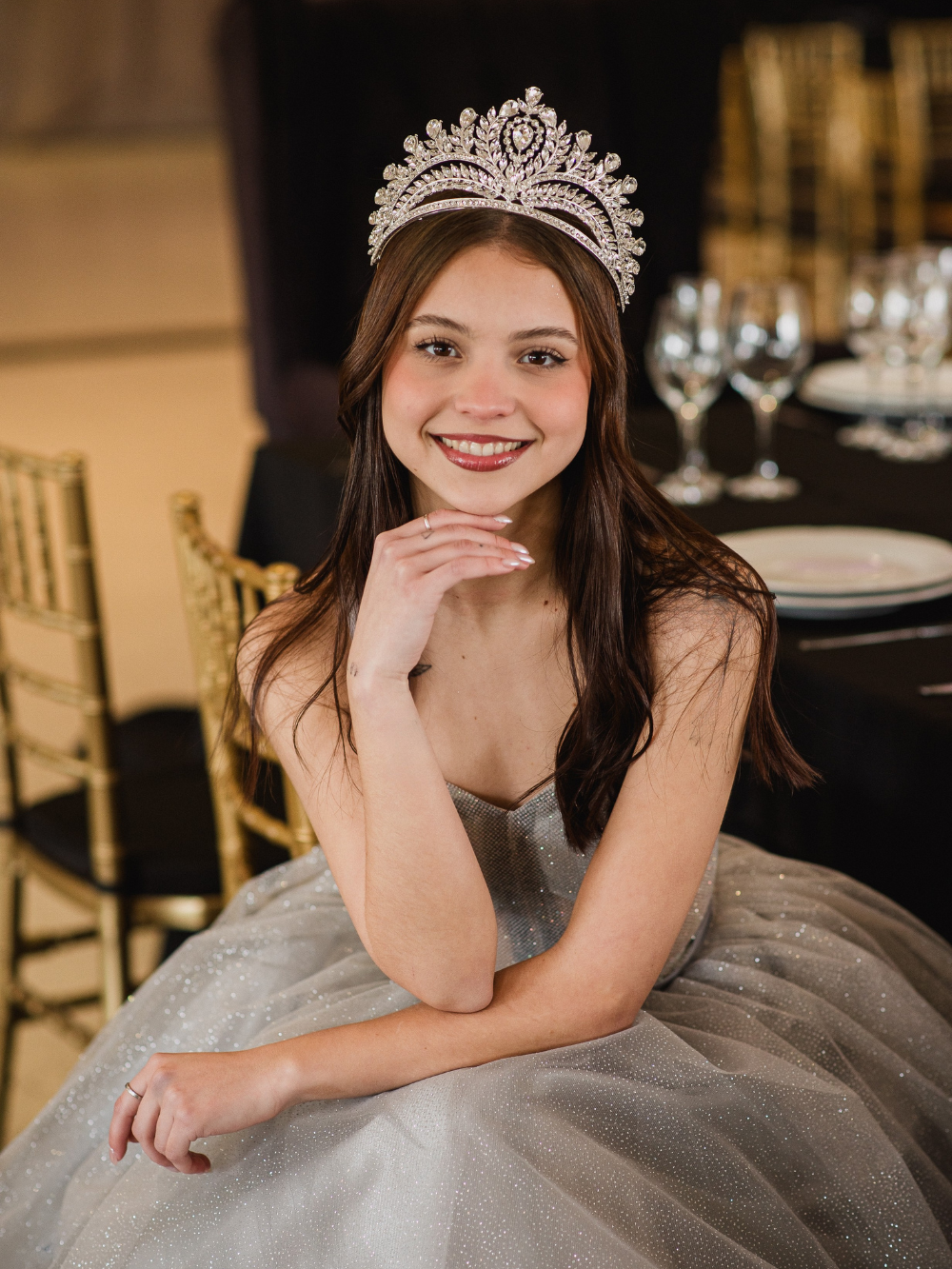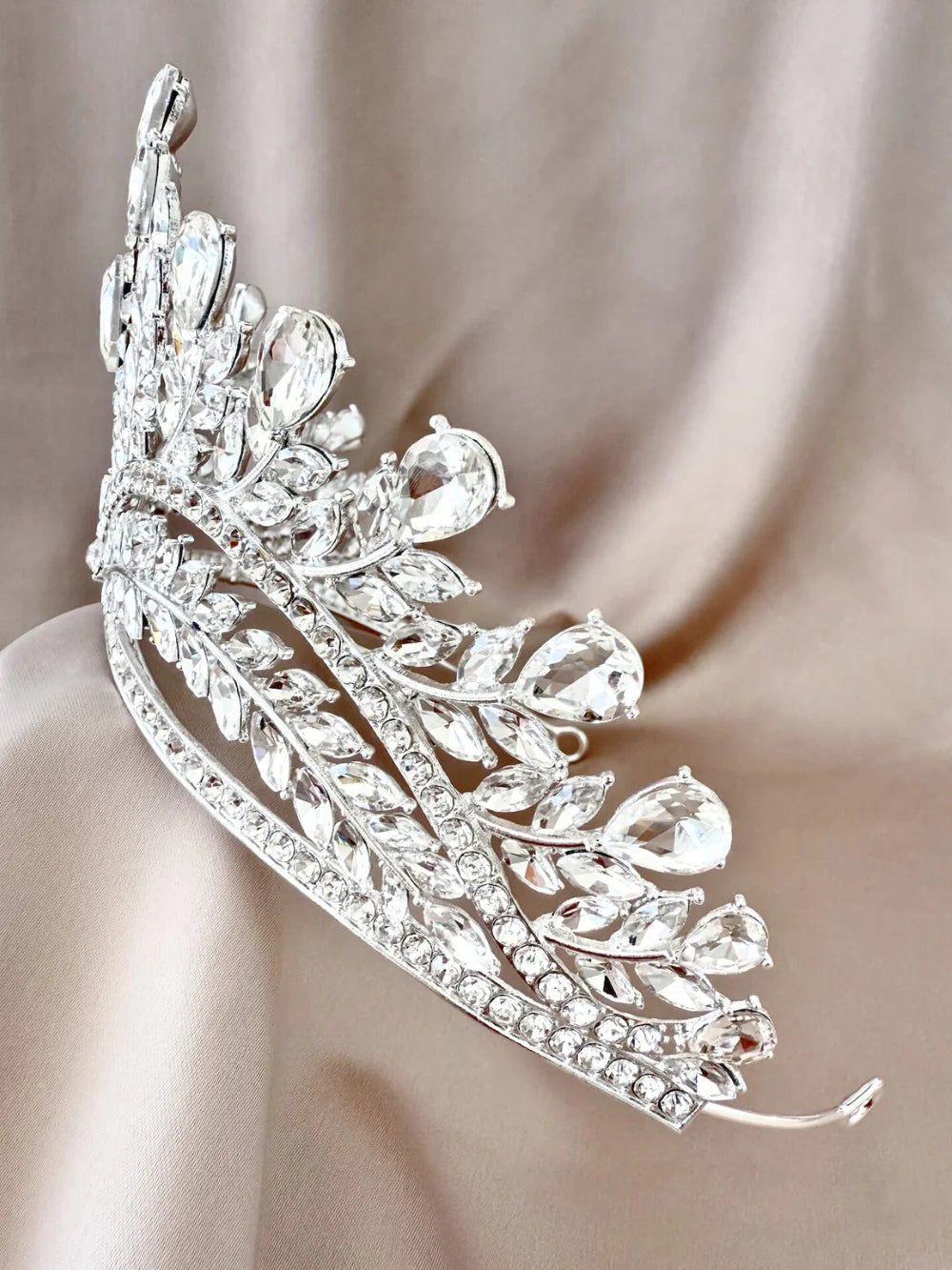 La Corona Elipse de Cristal Blanca es la elección perfecta para quienes sueñan con un look clásico y radiante. Su diseño imponente combina gemas transparentes en forma de lágrima con delicadas hojas brillantes, evocando pureza y elegancia atemporal. Una pieza versátil que realza tanto a novias en su gran día como a quinceañeras que buscan un brillo imponente y distinguido.