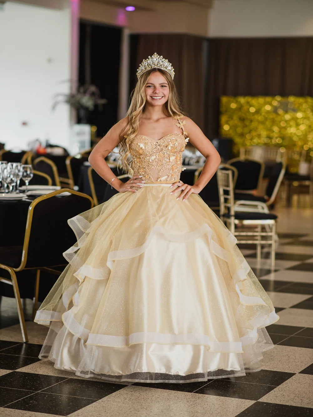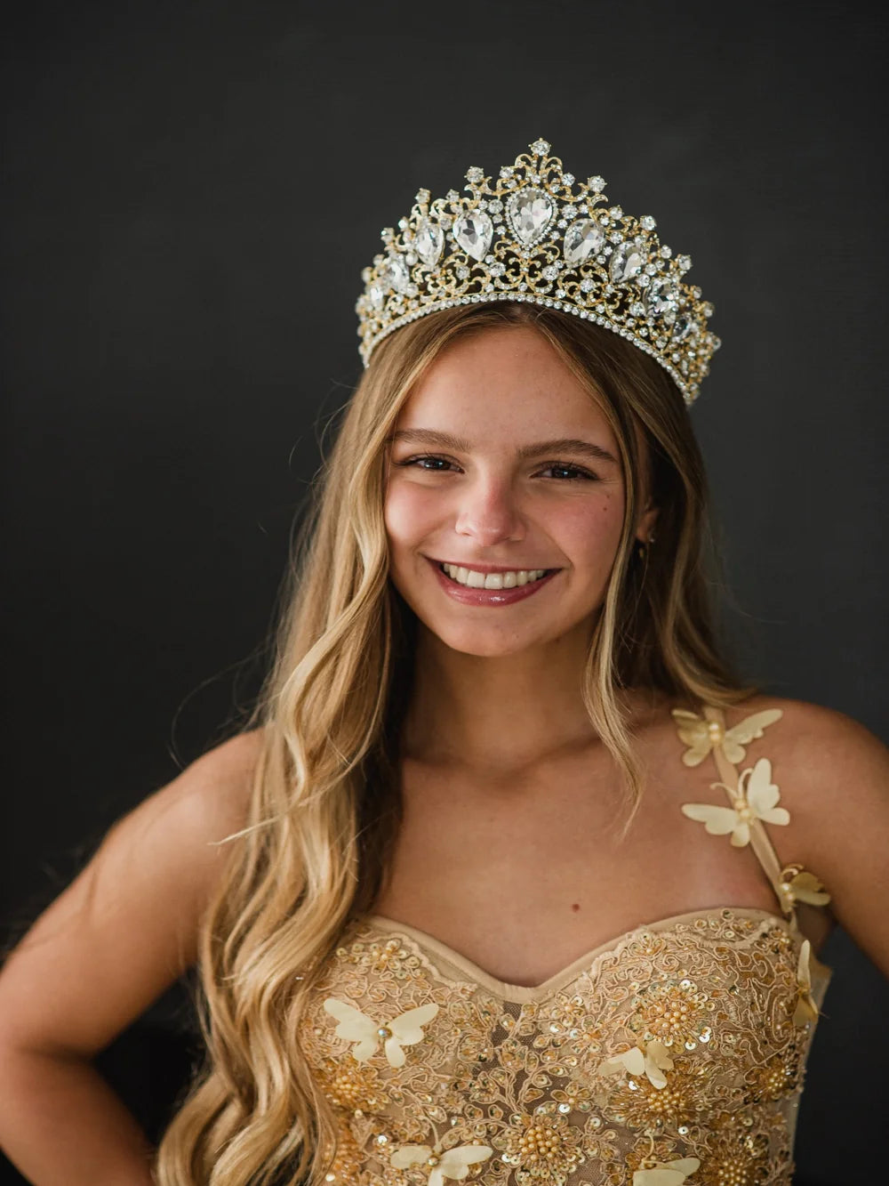 La Corona Emperatriz de Cristal Dorada es sinónimo de majestuosidad y exclusividad. Su base dorada realza el resplandor de las piedras cristalinas, creando un efecto cálido y lujoso. Ideal para quinceañeras que desean un detalle de realeza en su look o para las chicas que buscan impactar con un accesorio único y poderoso. Su diseño imponente y sujeción segura la convierten en una pieza digna de toda reina.