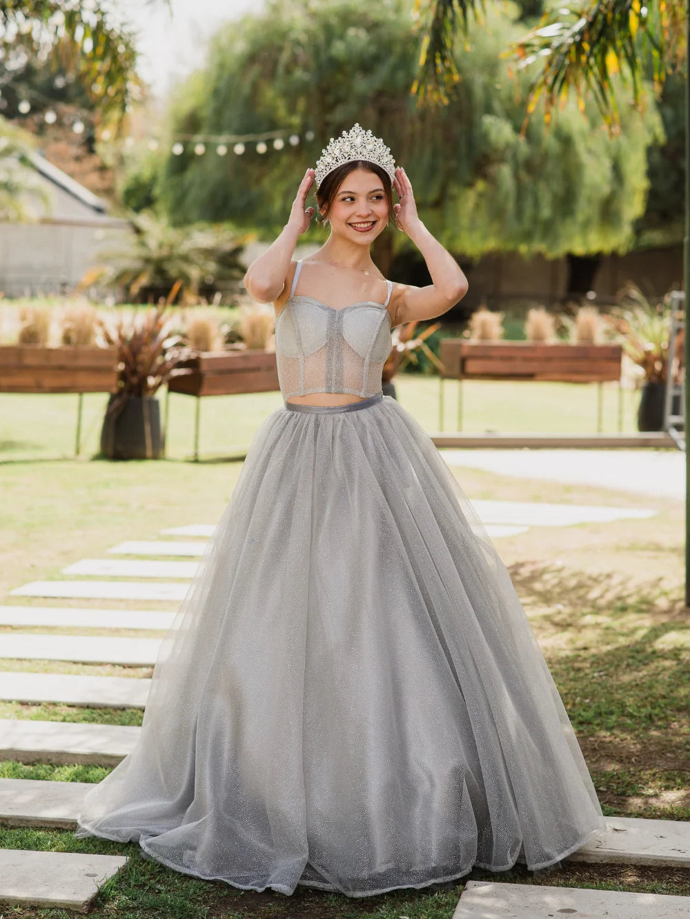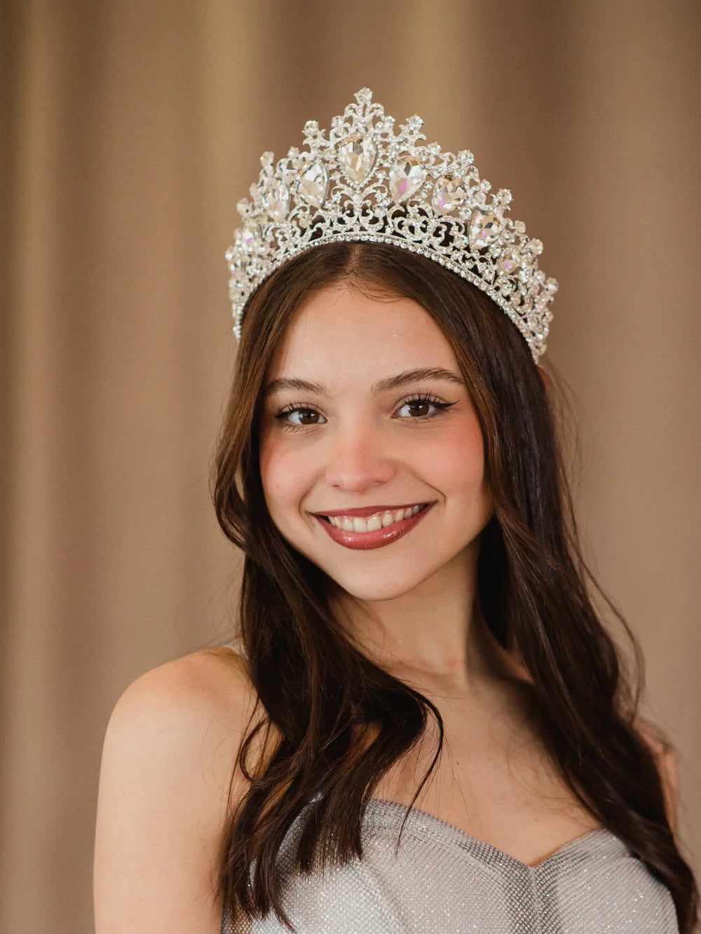 La Corona Emperatriz de Cristal Plateada deslumbra con un diseño regio y sofisticado. Sus piedras en talla lágrima de gran tamaño reflejan un brillo intenso que ilumina el rostro en cada paso. Perfecta para novias que sueñan con un look glamoroso o para quinceañeras que desean un accesorio imponente y elegante en su gran noche. Su estructura plateada de aleación premium garantiza resistencia, comodidad y un acabado de lujo que resalta en cualquier peinado.