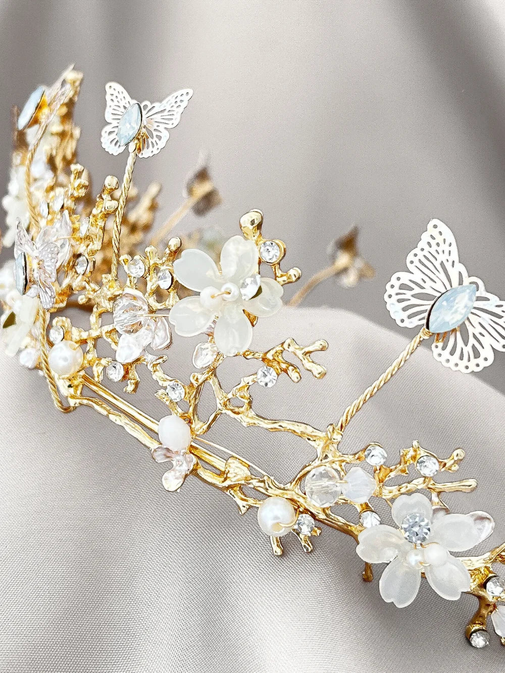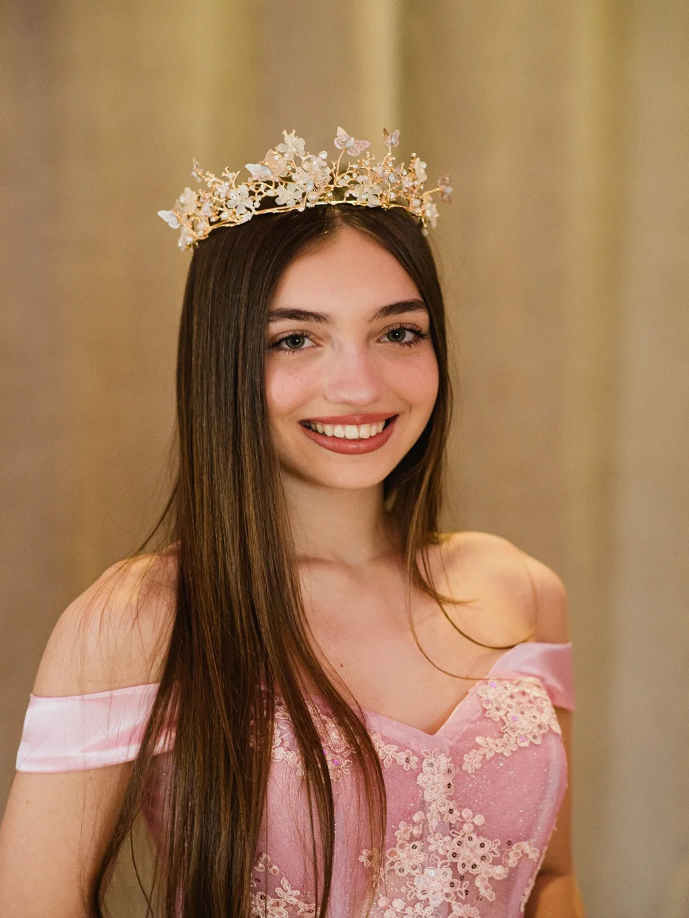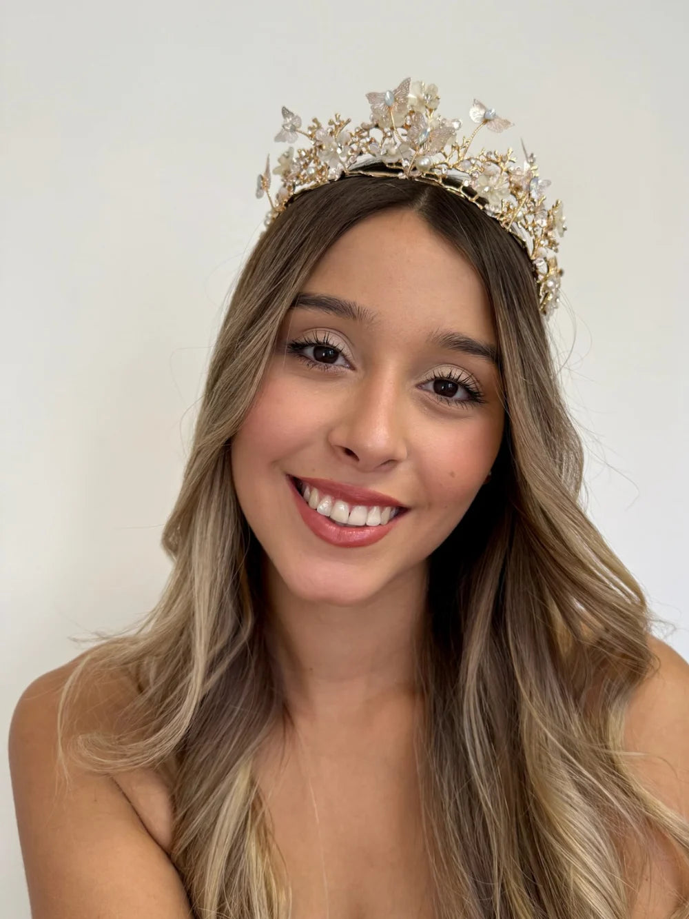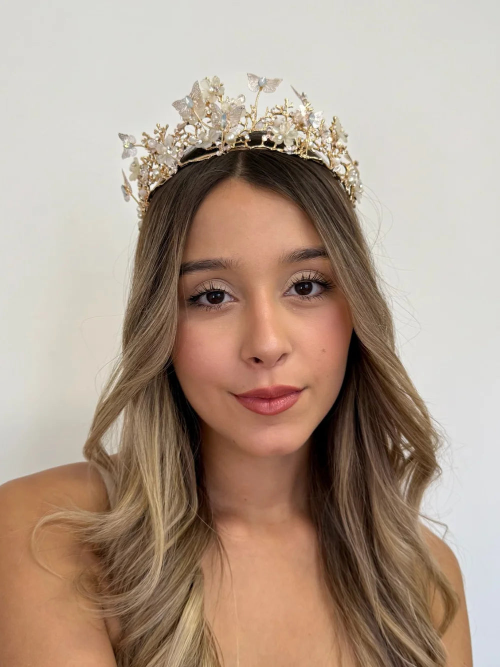 Jardín de Luz es una corona que captura la esencia de la primavera y la transforma en una joya encantadora. Inspirada en la delicadeza de los jardines floridos, los brotes naturales y el vuelo suave de las mariposas, esta pieza fue diseñada para mujeres que desean coronar su día especial con poesía visual, belleza orgánica y un aura luminosa y femenina.