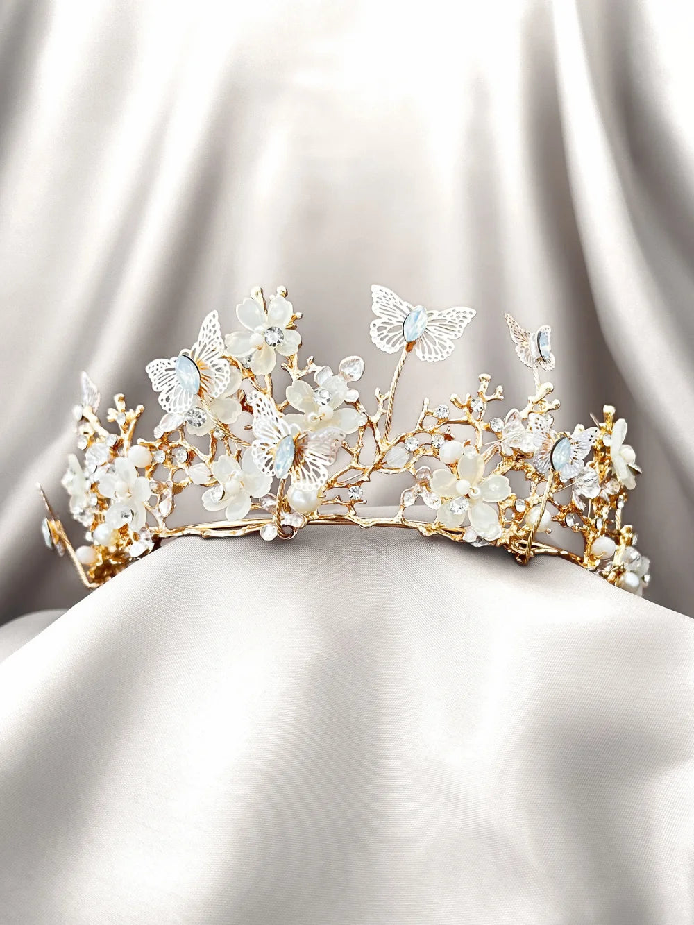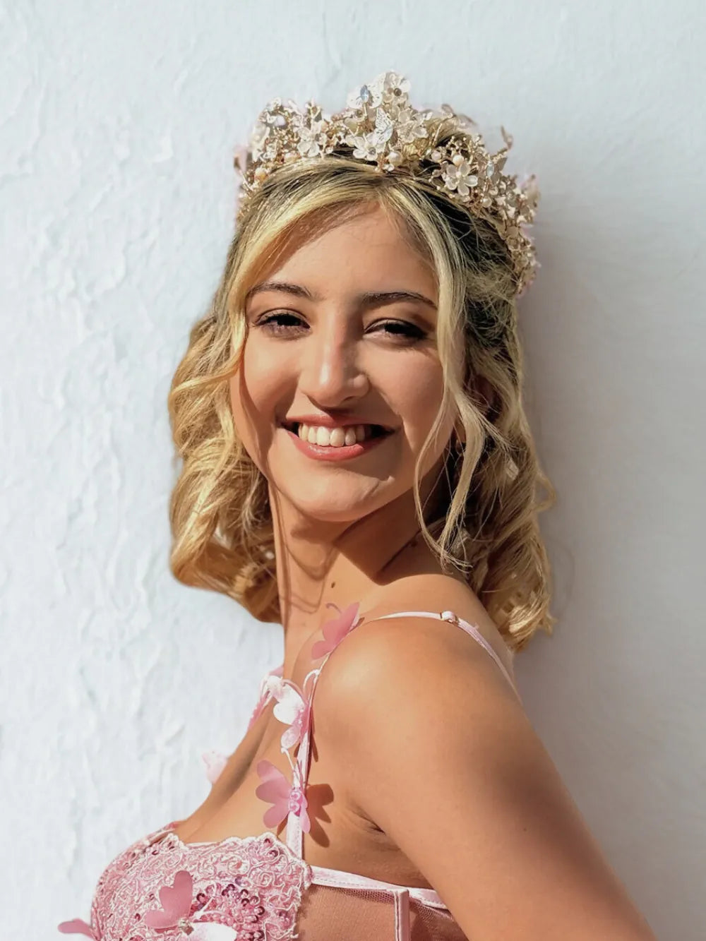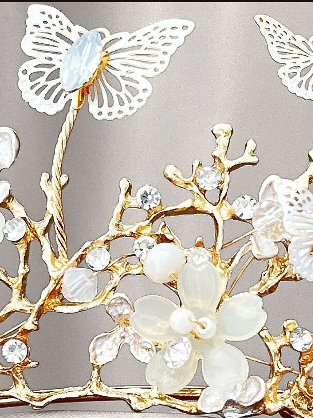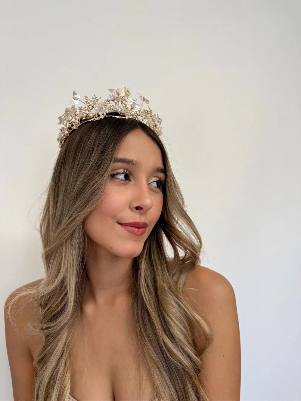 Jardín de Luz es una corona que captura la esencia de la primavera y la transforma en una joya encantadora. Inspirada en la delicadeza de los jardines floridos, los brotes naturales y el vuelo suave de las mariposas, esta pieza fue diseñada para mujeres que desean coronar su día especial con poesía visual, belleza orgánica y un aura luminosa y femenina.