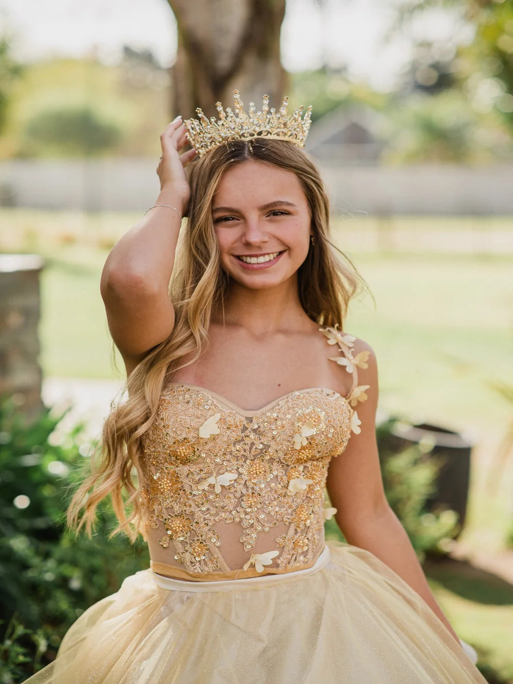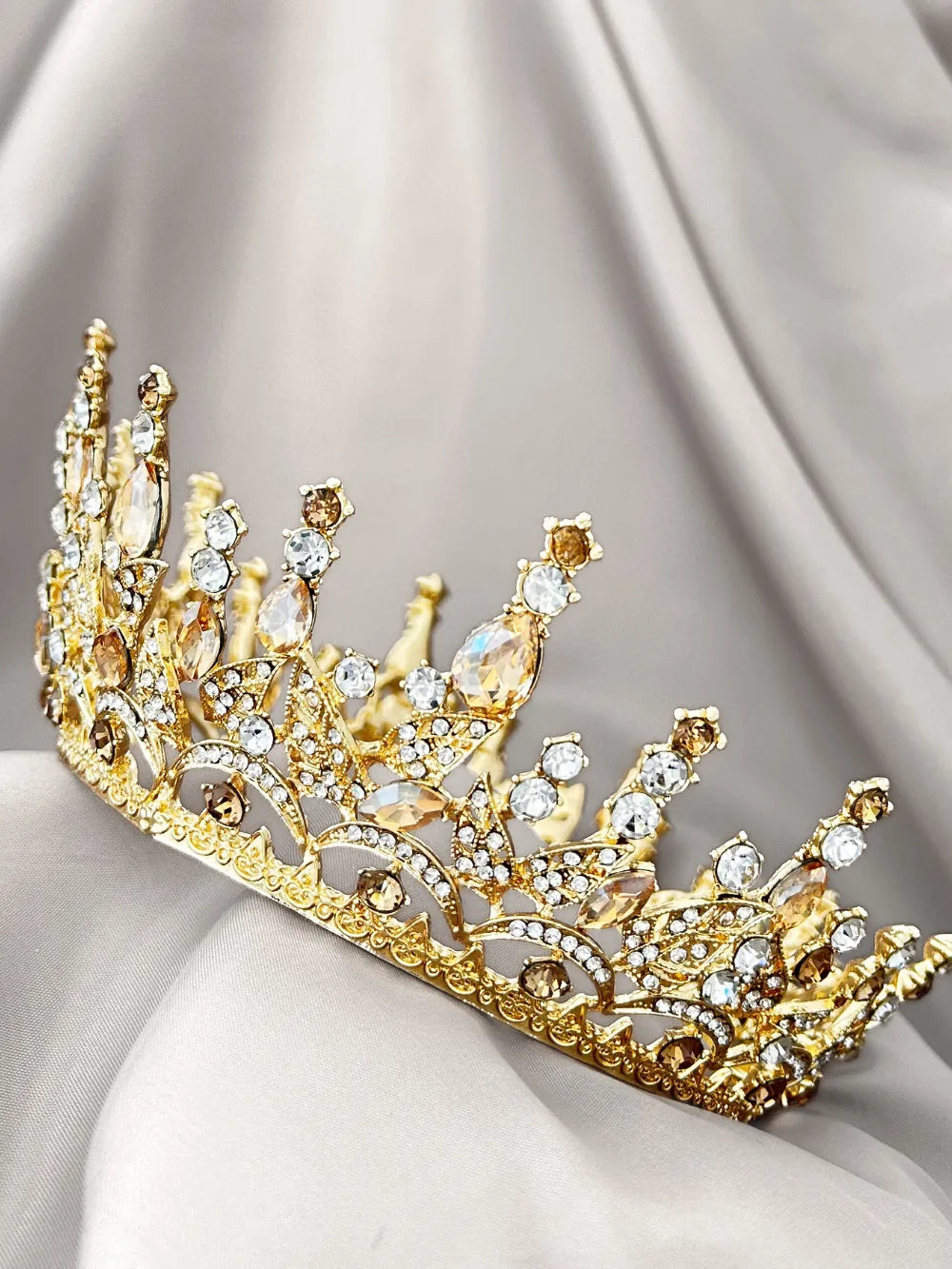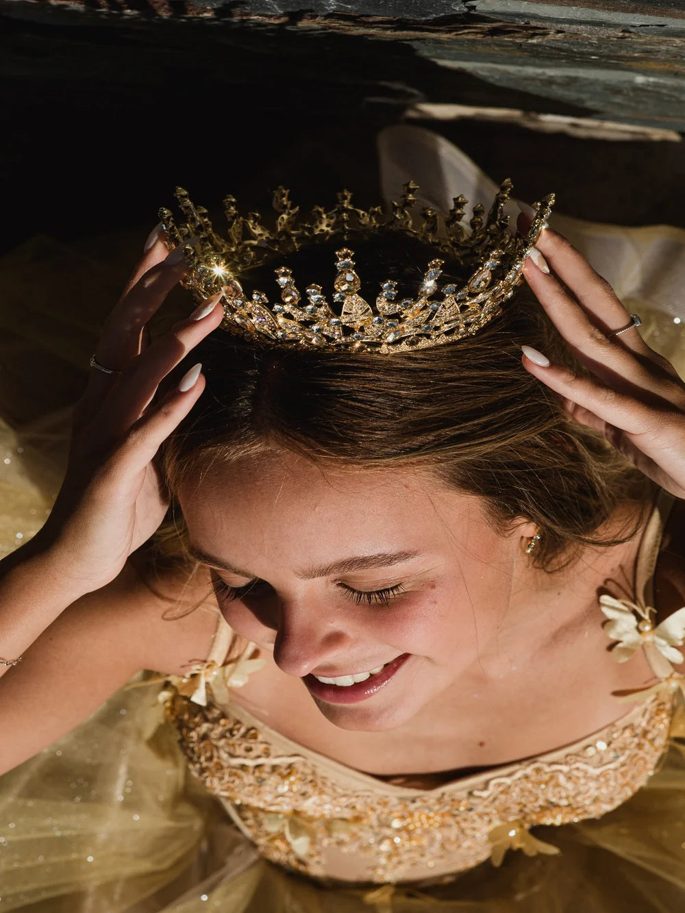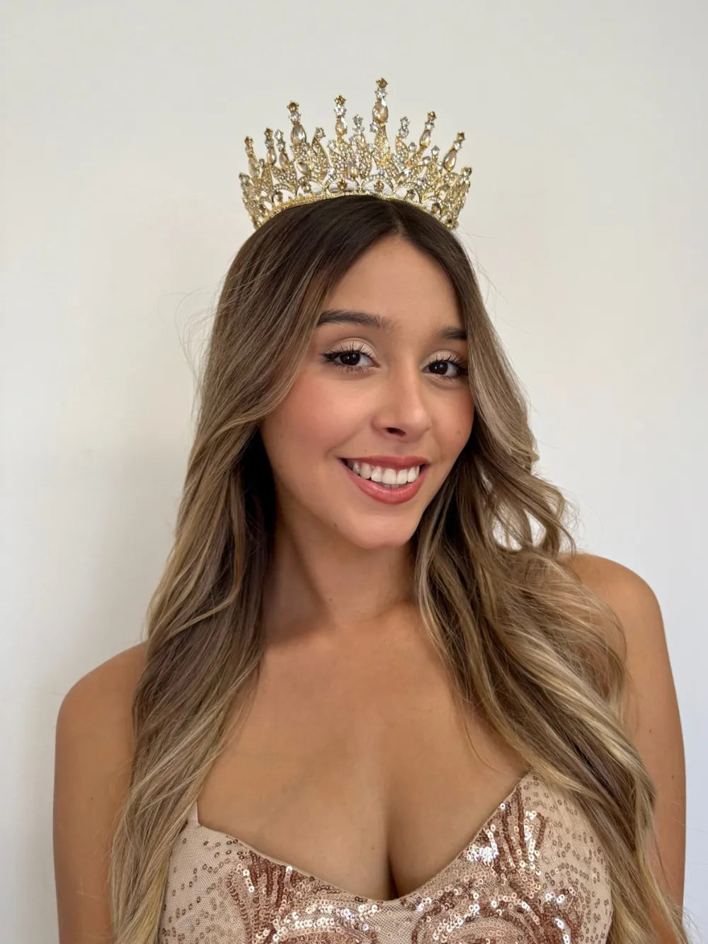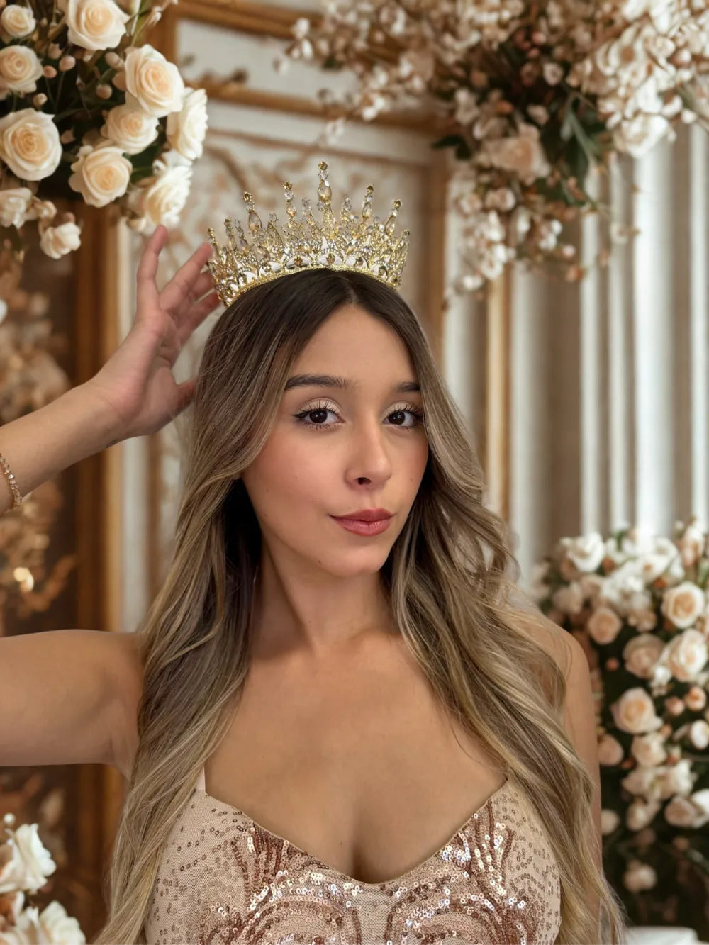 Llama Real – Oro es una corona que impone desde su estructura, brilla desde cada ángulo y transforma cualquier evento en una coronación digna de una reina. Esta joya de forma circular completa ha sido diseñada para envolver la cabeza con majestuosidad, otorgando una presencia imponente y sofisticada que no deja lugar a dudas: quien la lleve es la protagonista indiscutible.