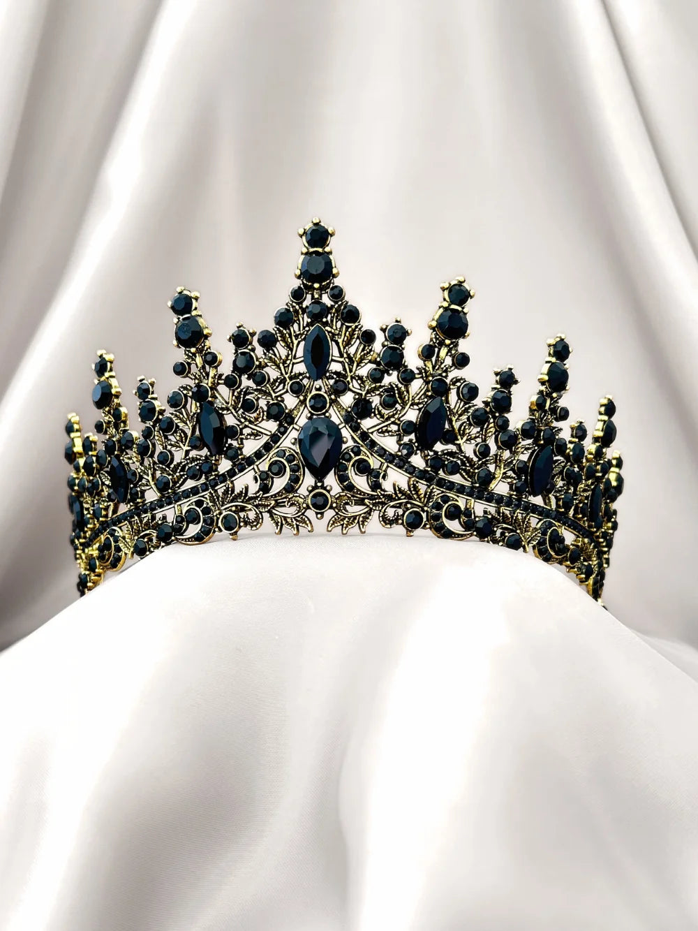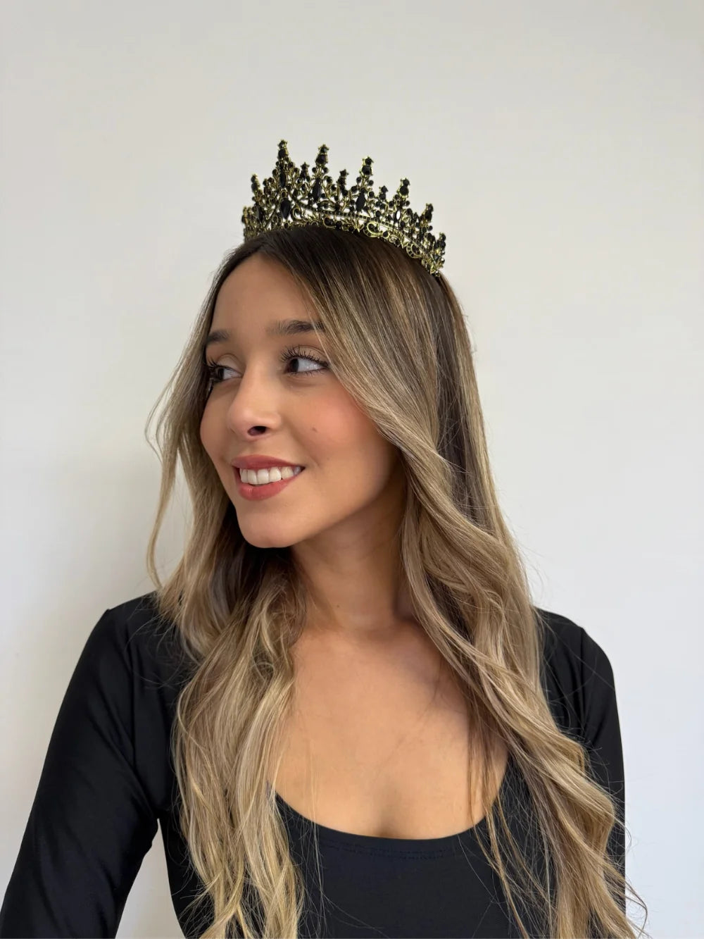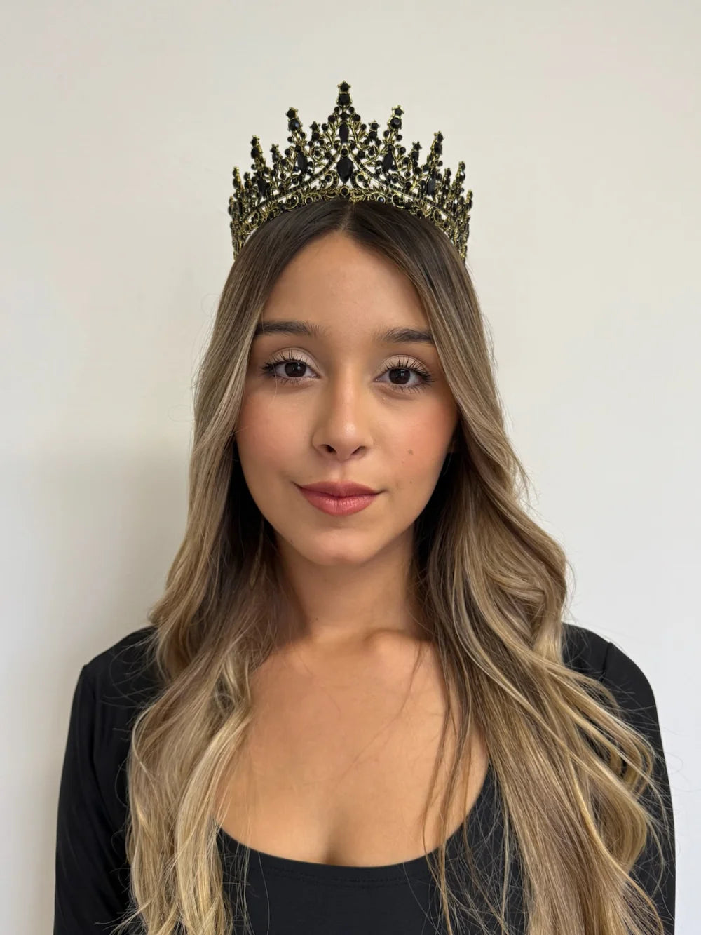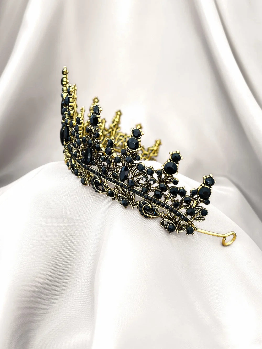 Noche Imperial – Base Oro Viejo es una corona que combina historia, mística y elegancia atemporal. Su diseño de inspiración barroca, su acabado envejecido y la profundidad de sus piedras negras la convierten en una pieza ideal para quienes desean transmitir una presencia fuerte, oscura y sofisticada. Esta joya no sigue tendencias: las impone.
