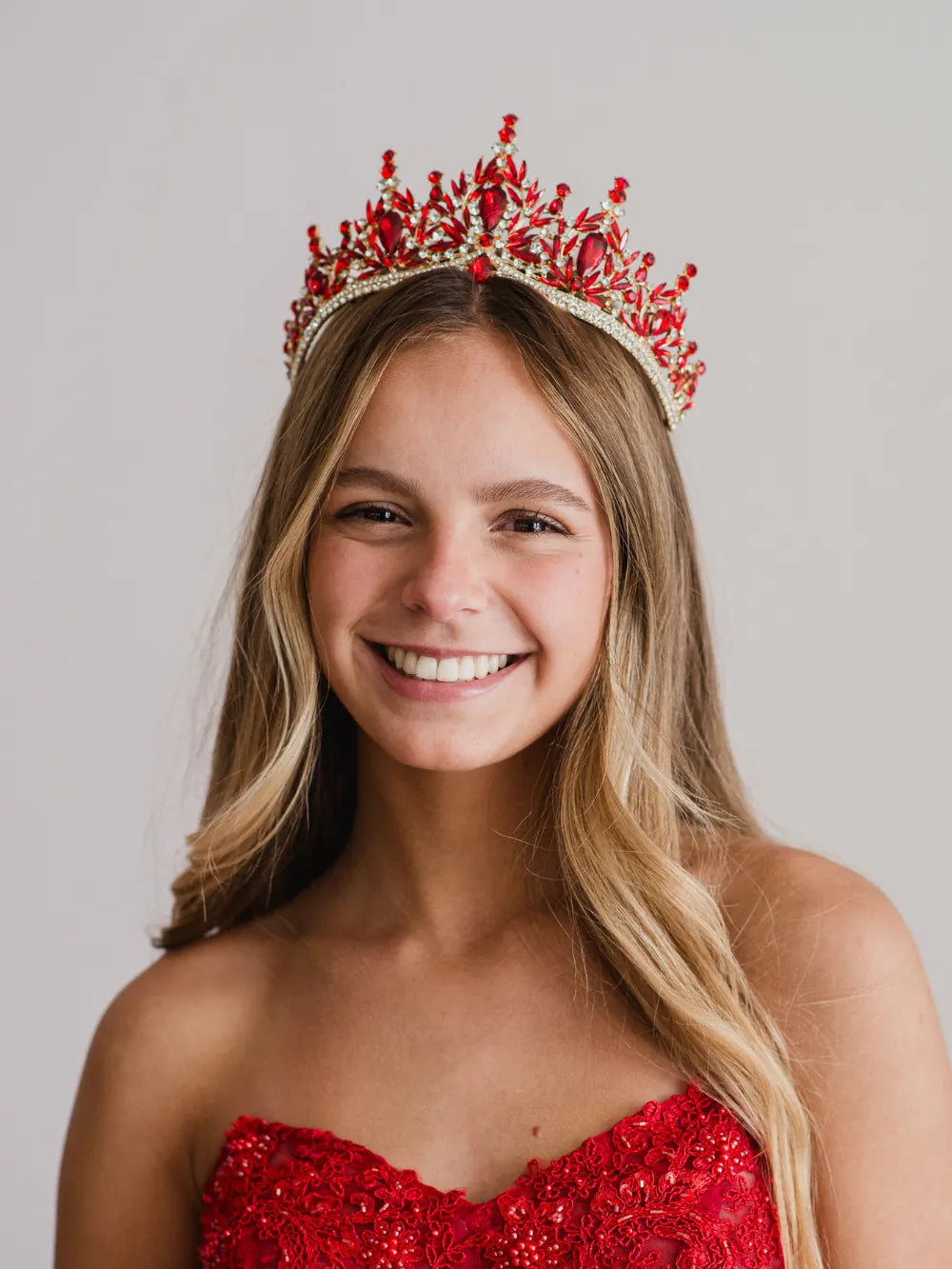 Trono Celestial – Rojo Rubí es una corona que transmite poder desde la primera mirada. Con un diseño majestuoso y un color impactante, esta pieza fue creada para quienes desean vivir su gran momento con una presencia imponente, elegante y completamente inolvidable. Es ideal tanto para quinceañeras que sueñan con una entrada triunfal y diferenciarse con estilo propio y carácter.
