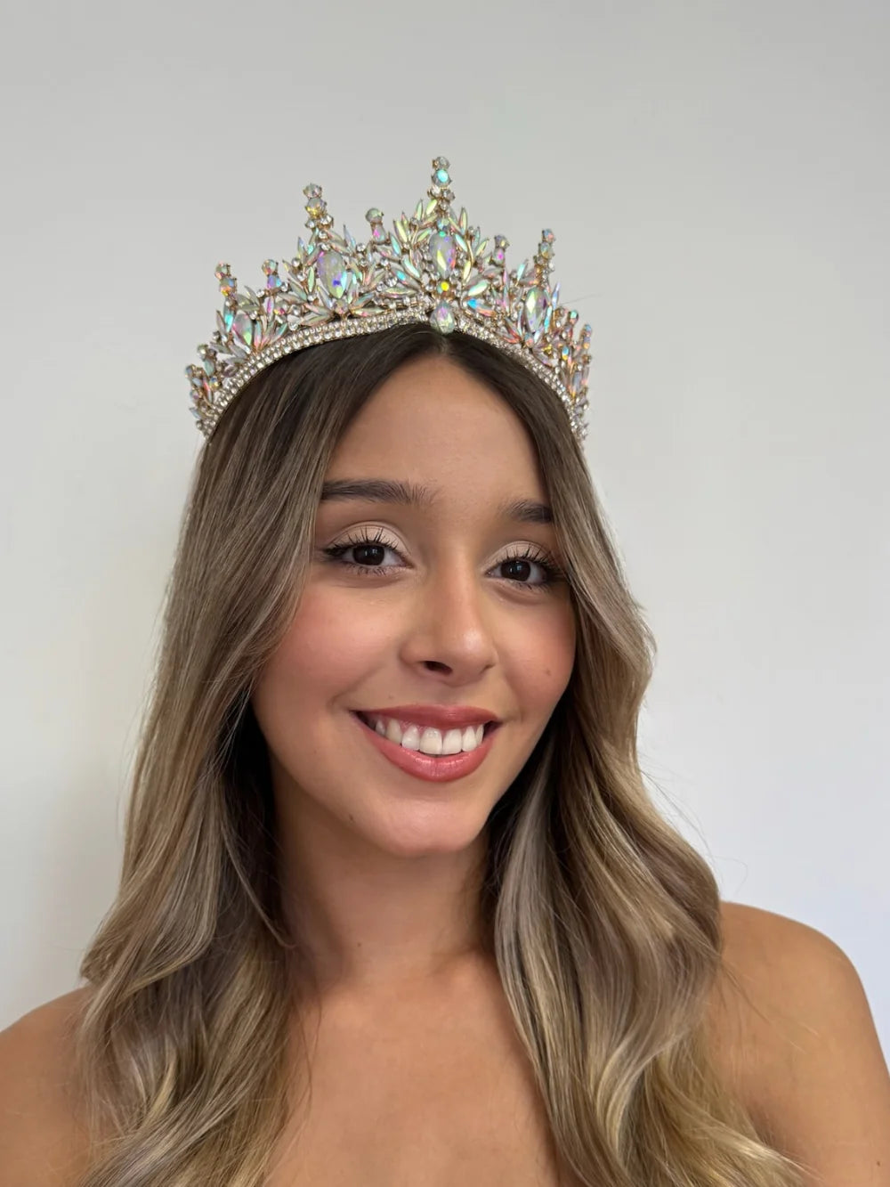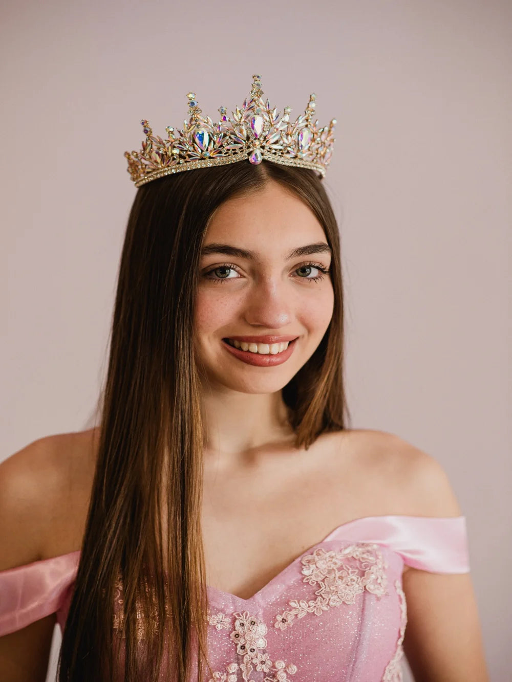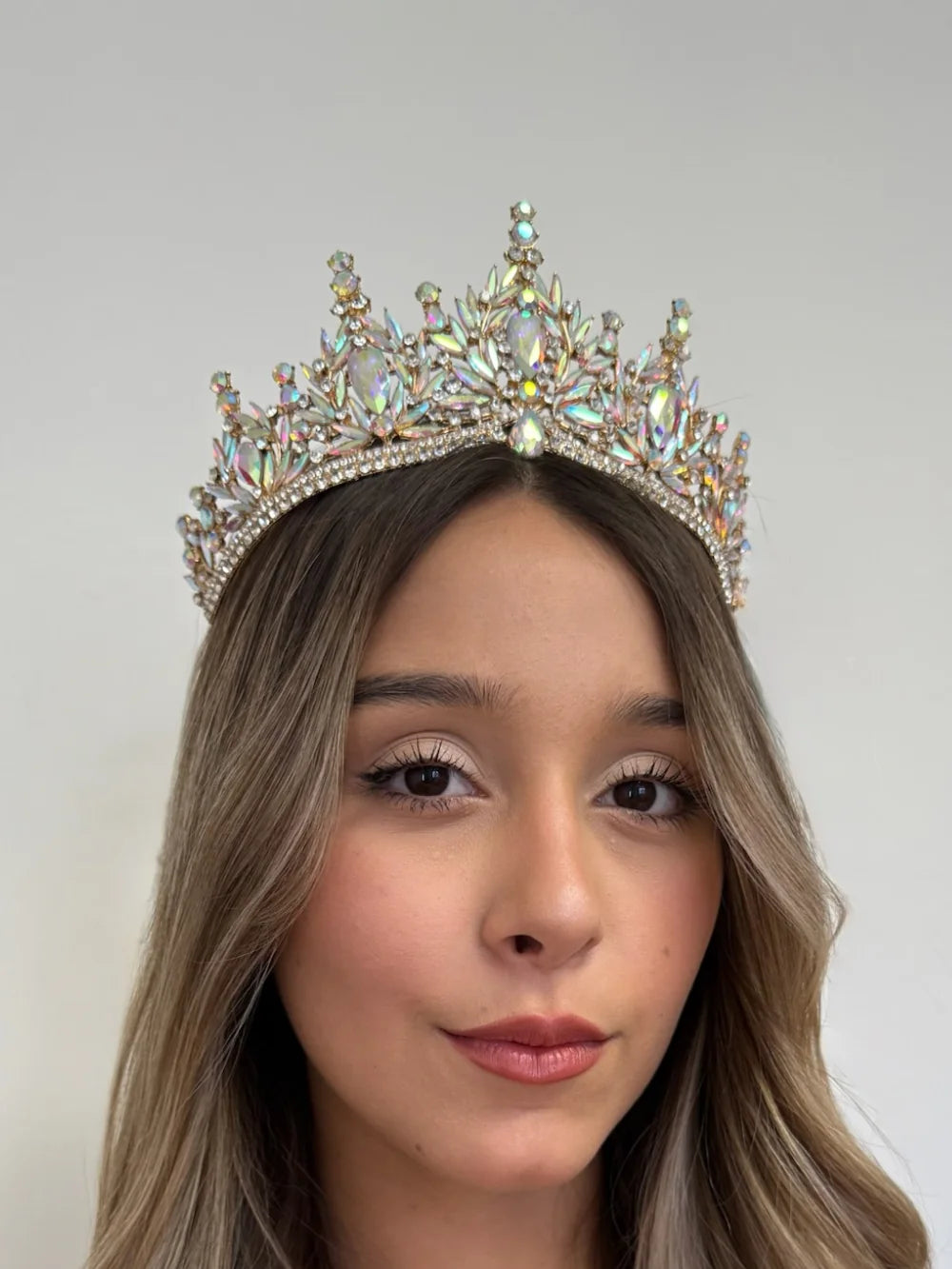 Corona Trono Celestial – Tornasol Galaxia es una corona que parece traída de otro mundo. Esta joya deslumbrante combina lo etéreo con lo impactante, con un diseño que recuerda a constelaciones en movimiento y cristales que capturan la luz como si reflejaran el universo entero. Fue creada para quienes desean brillar como nunca, para protagonistas de grandes celebraciones que entienden que su momento es único, y merecen destacarse como estrellas.