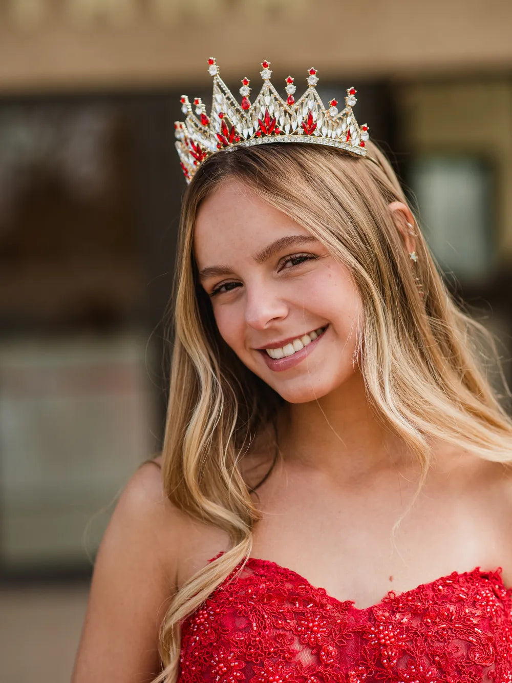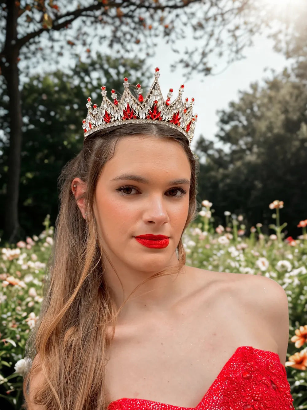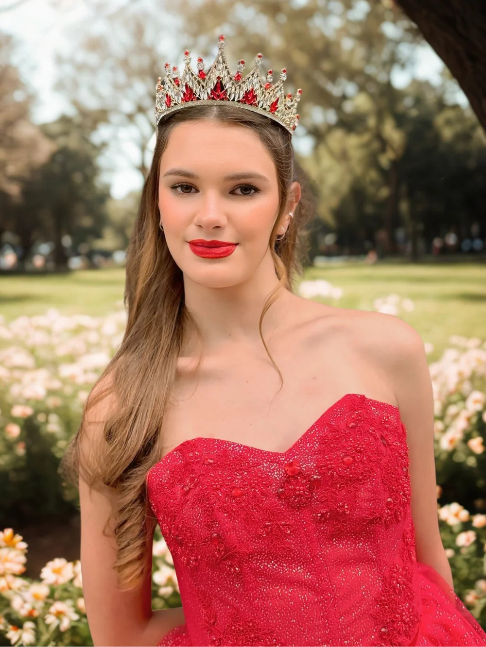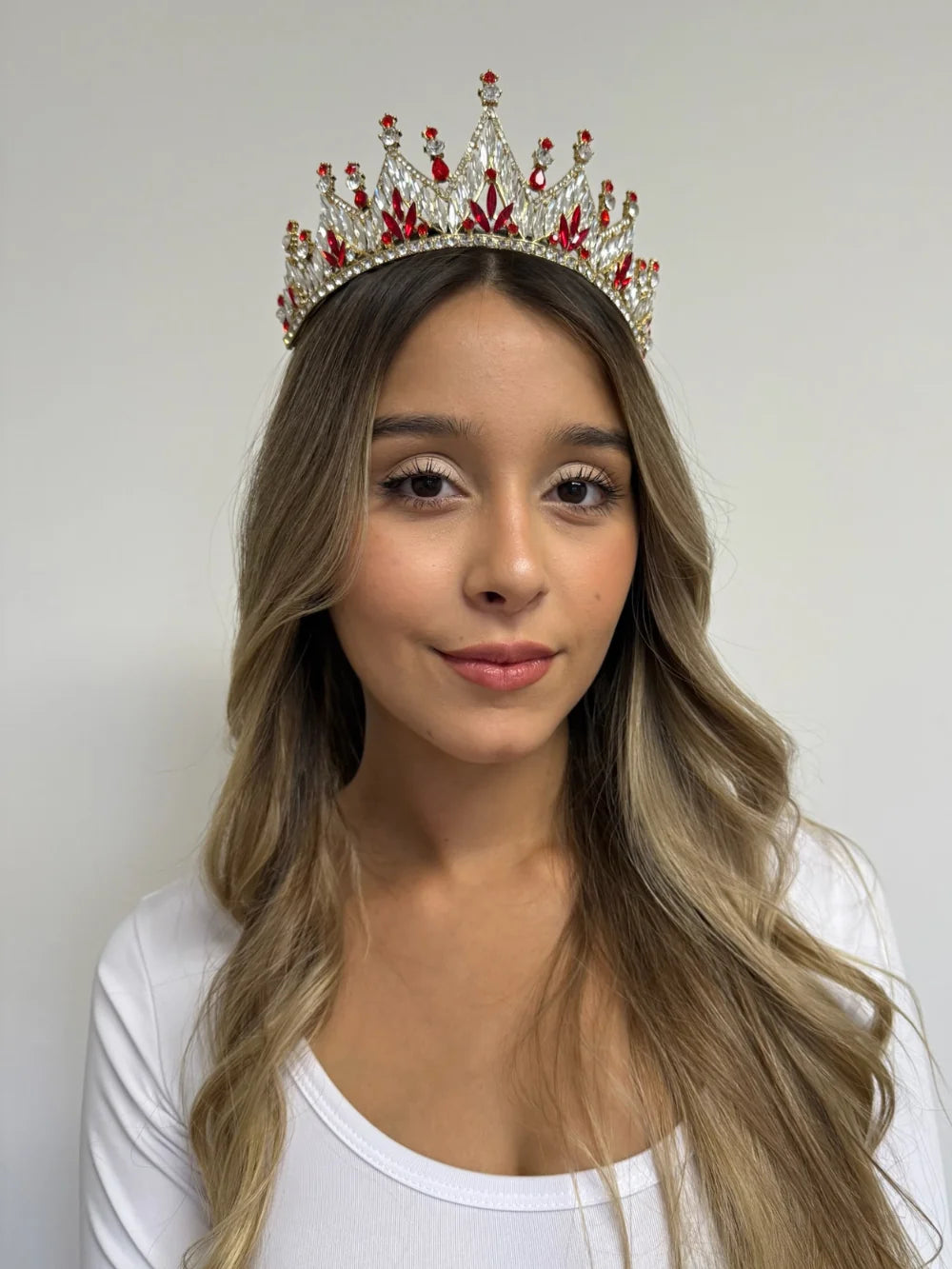 La Corona Cristal Imperial – Rubí es una tiara que no pasa desapercibida. Diseñada para mujeres que desean expresarse con poder, belleza y personalidad, esta pieza combina una estructura dorada con un deslumbrante trabajo de cristales en rojo rubí. Su diseño floral y curvo, de inspiración real, la convierte en una joya perfecta tanto para quinceañeras que buscan un accesorio diferente y desean marcar su noche con una entrada inolvidable.