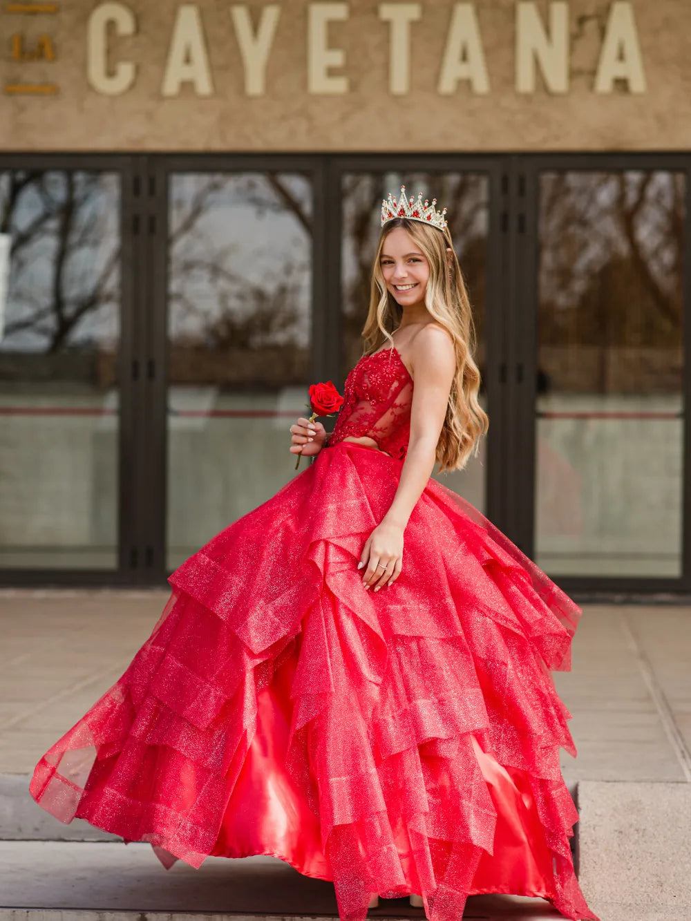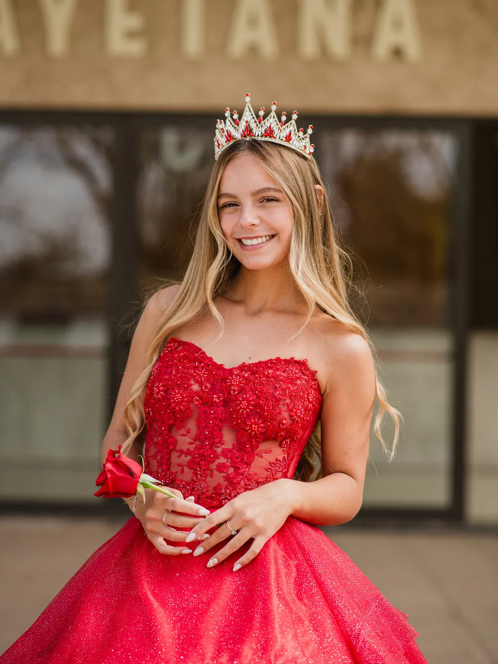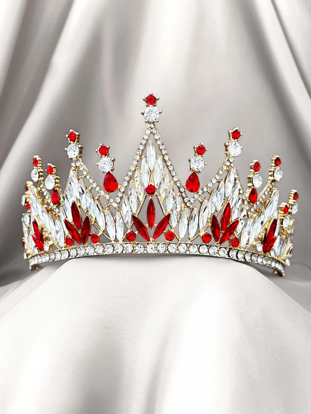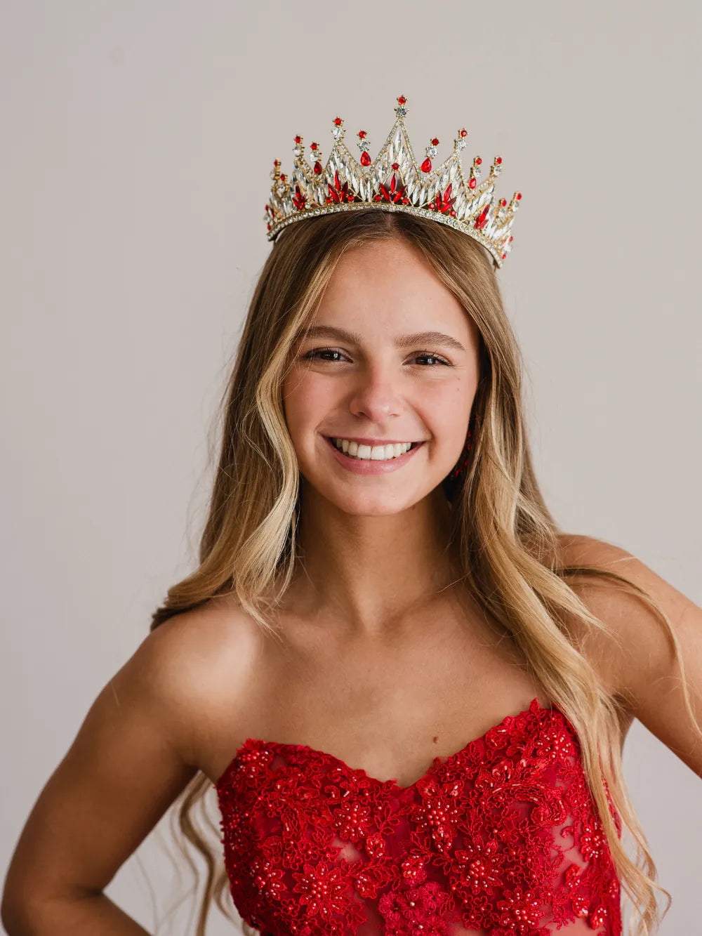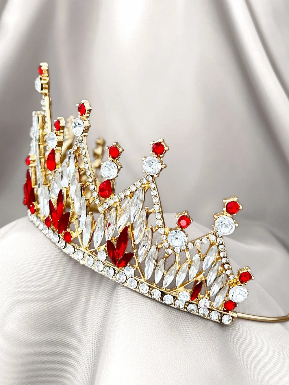 La Corona Cristal Imperial – Rubí es una tiara que no pasa desapercibida. Diseñada para mujeres que desean expresarse con poder, belleza y personalidad, esta pieza combina una estructura dorada con un deslumbrante trabajo de cristales en rojo rubí. Su diseño floral y curvo, de inspiración real, la convierte en una joya perfecta tanto para quinceañeras que buscan un accesorio diferente y desean marcar su noche con una entrada inolvidable.