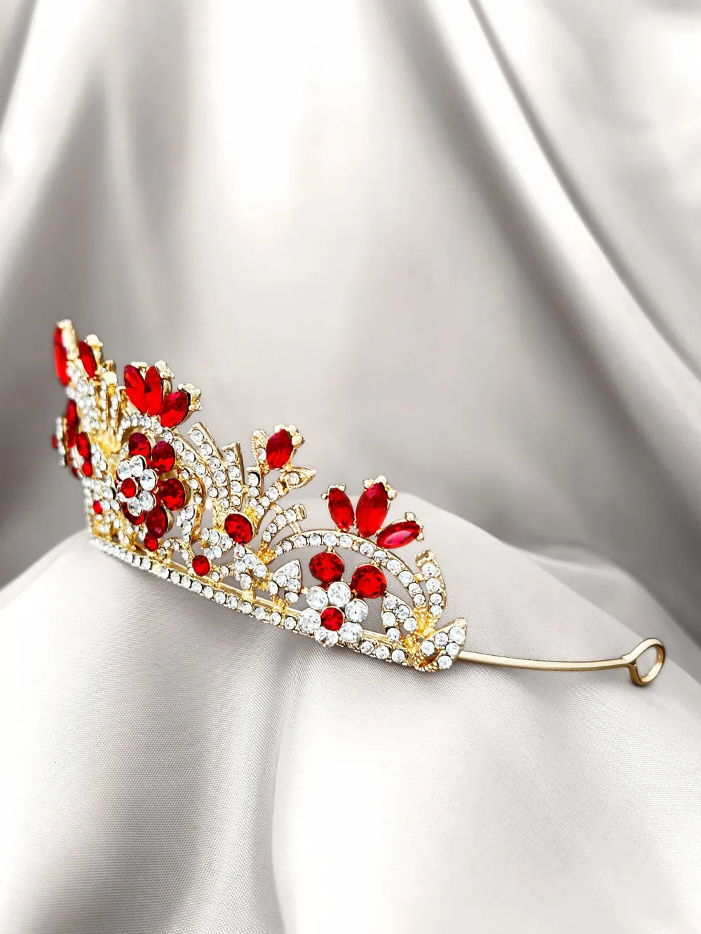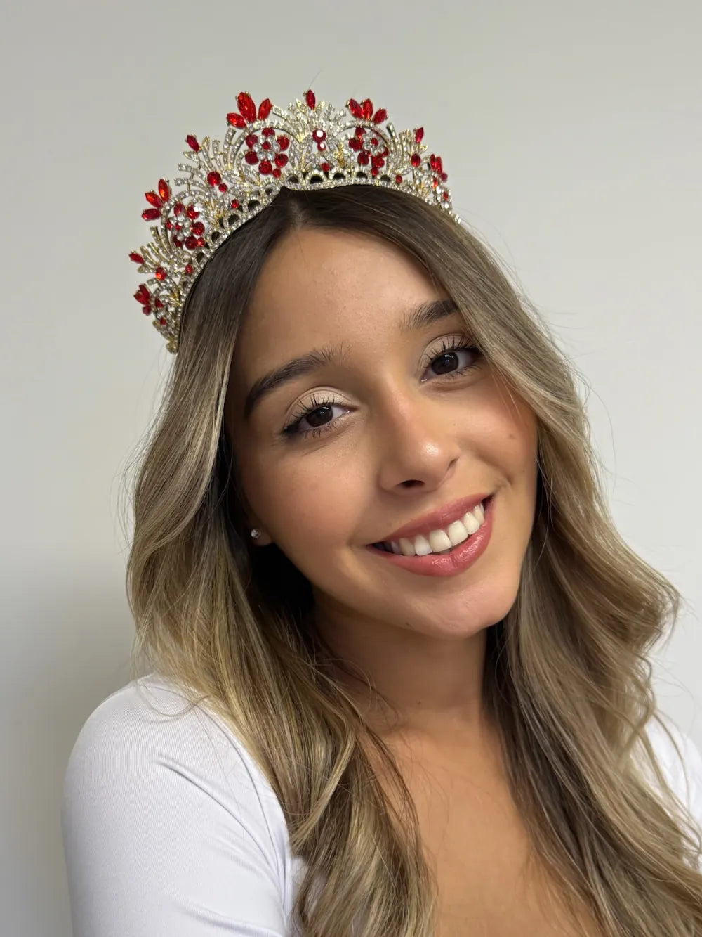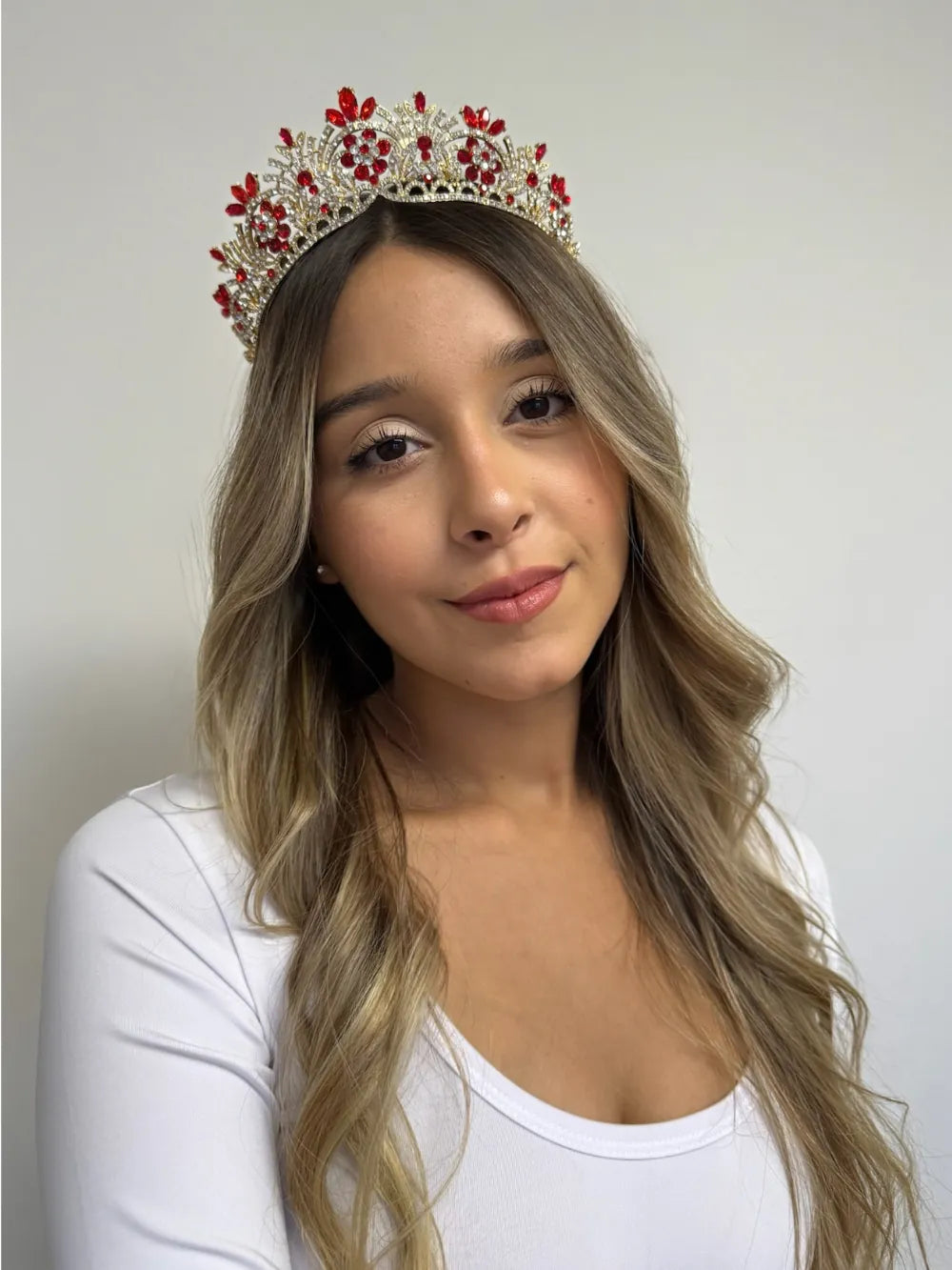 Tiara Aura Real – Rubí es una joya que nace para acompañar momentos donde la belleza no busca ser discreta, sino inolvidable. Con una estructura dorada y piedras en un rojo rubí intenso, esta pieza irradia fuerza, pasión y elegancia en su máxima expresión. Pensada para mujeres jóvenes que desean una presencia majestuosa y con carácter, se convierte en el complemento ideal para celebraciones de 15 años con estilo vibrante y audaz.