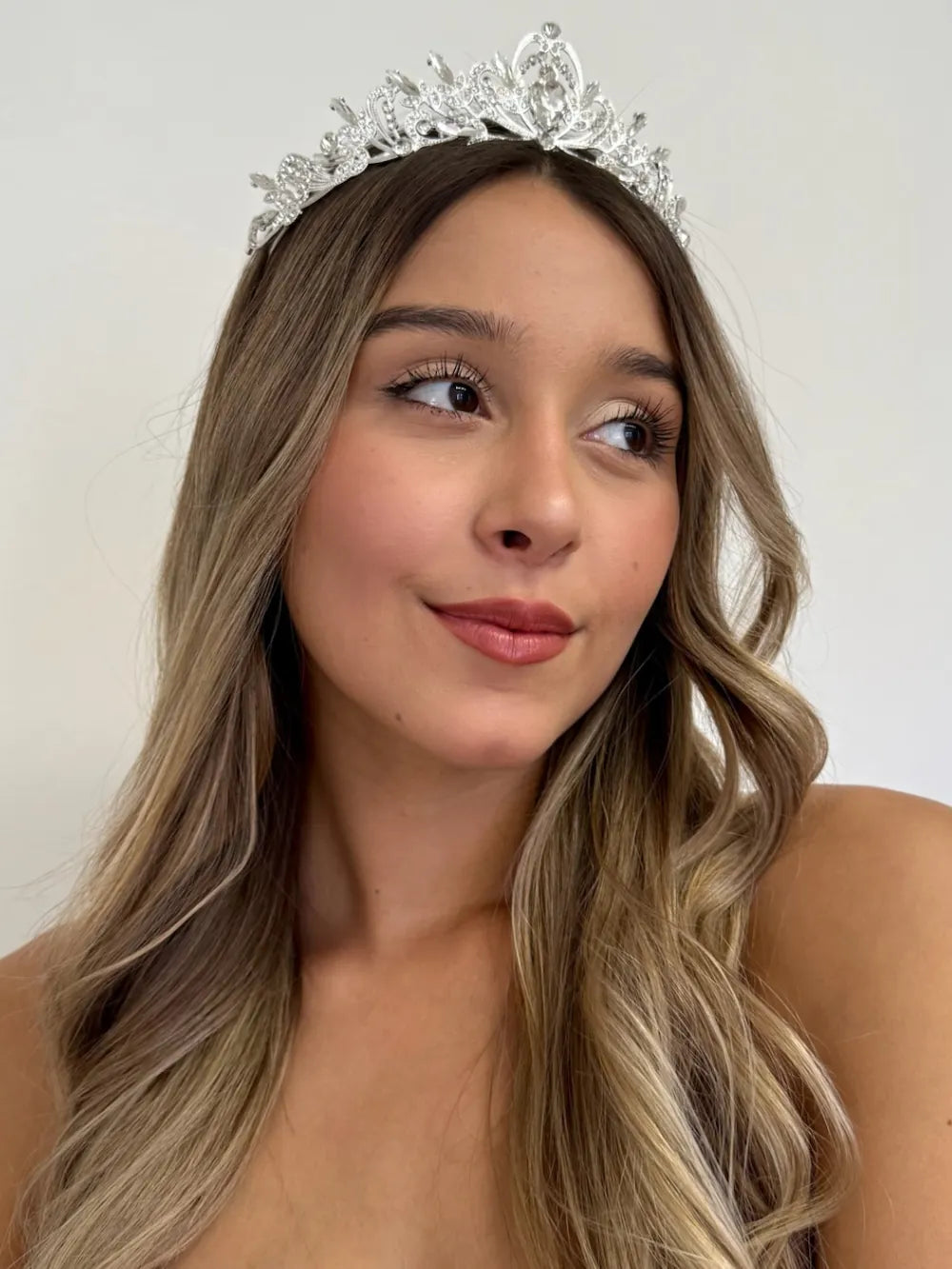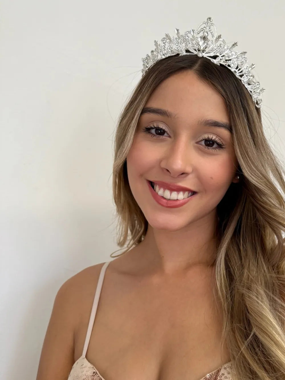 Tiara Encanto Nocturno – Cristal es una pieza que parece salida de un cuento bajo la luz de la luna. Su diseño curvo y refinado se compone de líneas suaves, motivos florales y destellos brillantes que envuelven el rostro con un aire de ensueño. Esta joya fue concebida para quinceañeras que valoran la elegancia sutil, el romanticismo y el poder de los detalles bien logrados.